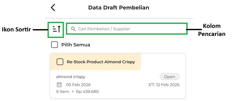 Gunakan kolom pencarian atau ikon sortir (mengurutkan draft pembelian terlama dan terbaru) untuk mempermudah pencarian data draft pembelian.