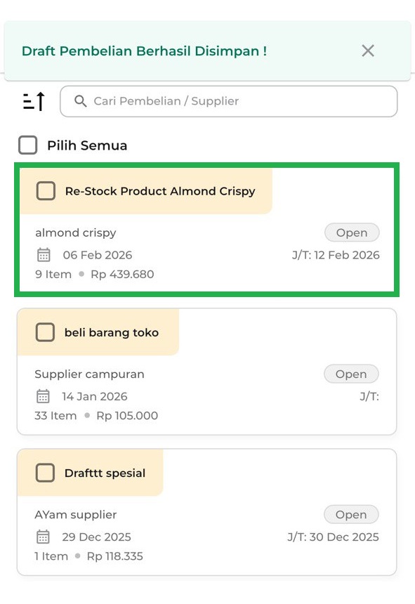 Fitur Draft Pembelian memudahkan Anda mencatat daftar barang yang akan dibeli dari supplier serta menyusun purchase order (PO) secara rapi dan efisien. Draft yang telah dibuat dapat diteruskan menjadi transaksi pembelian, sehingga stok barang akan otomatis bertambah dan terbarui di aplikasi Kasir Pintar.