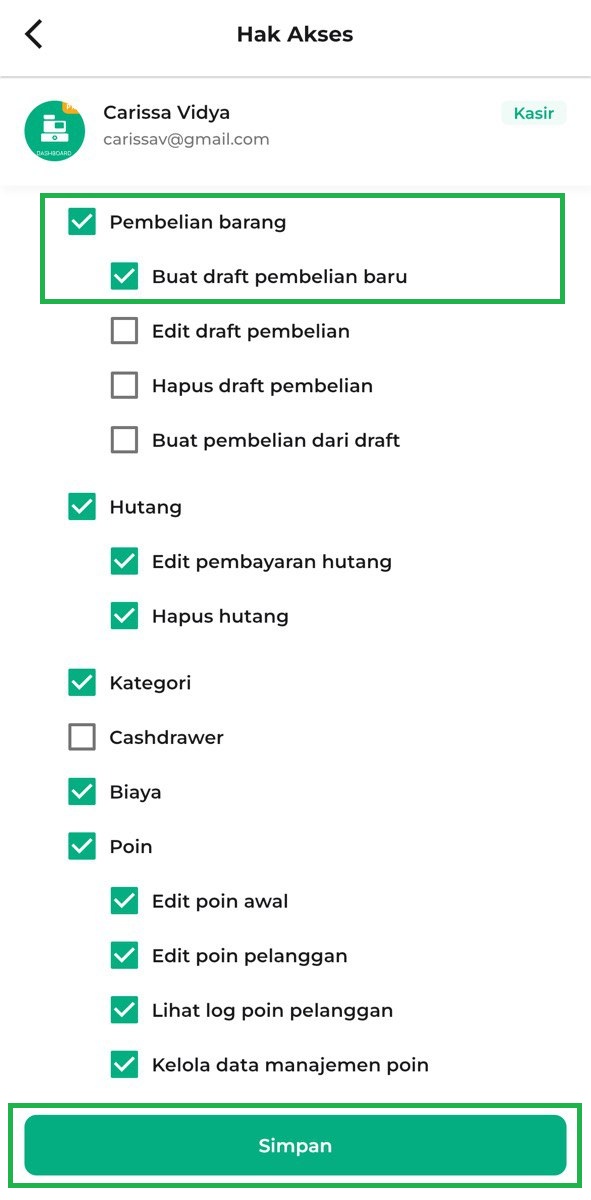 Berikut merupakan cara mengatur hak akses pada fitur draft pembelian yang diakses melalui aplikasi Kasir Pintar Dashboard versi iOS: