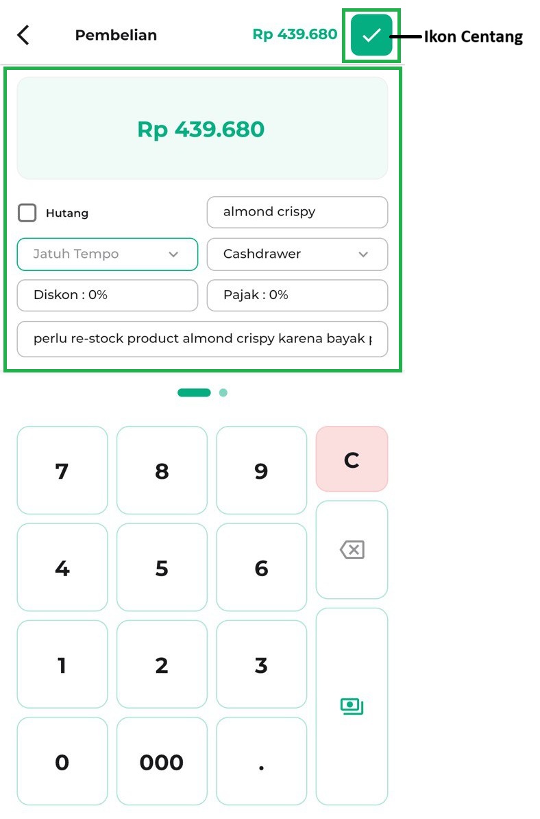- Setelah itu, periksa kembali semua data pembayaran, lalu klik ikon centang di pojok kanan atas untuk menyelesaikan pembayaran.