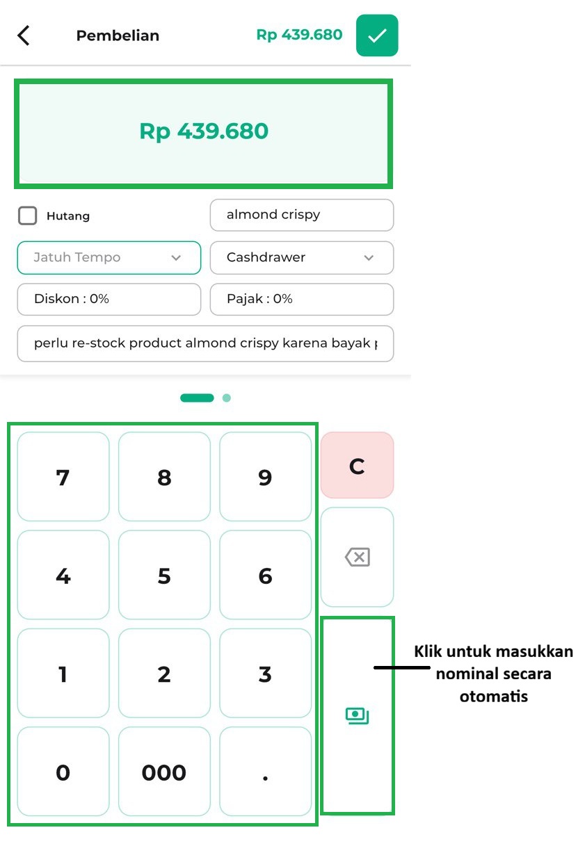 - Masukkan nominal uang yang dibayarkan ke supplier sesuai nominal yang telah ditampilkan.
