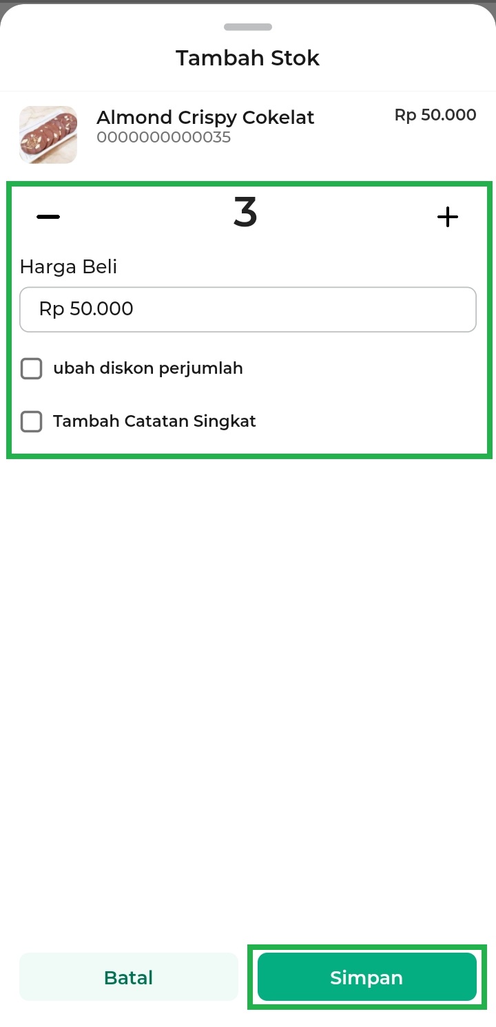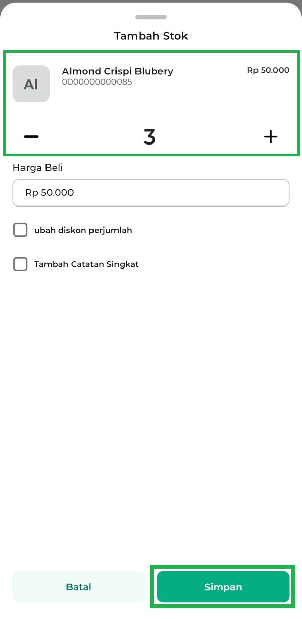 - Pilih barang dan atur jumlah stok barang yang akan ditambahkan ke draft pembelian. Selain itu, Anda bisa mengatur data lain seperti harga beli, ubah diskon barang per jumlah, dan tambah catatan singkat. Lalu, klik Simpan.