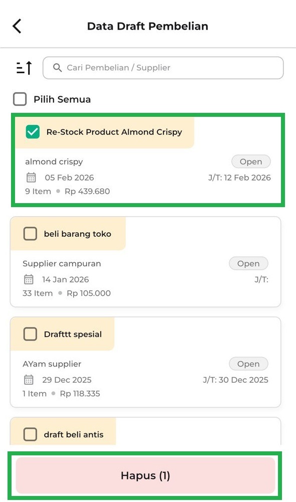 - Pilih draft pembelian yang akan dihapus, lalu klik kotak di sebelah nama draft pembelian. Selanjutnya, klik tombol hapus untuk melanjutkan hapus draft pembelian.