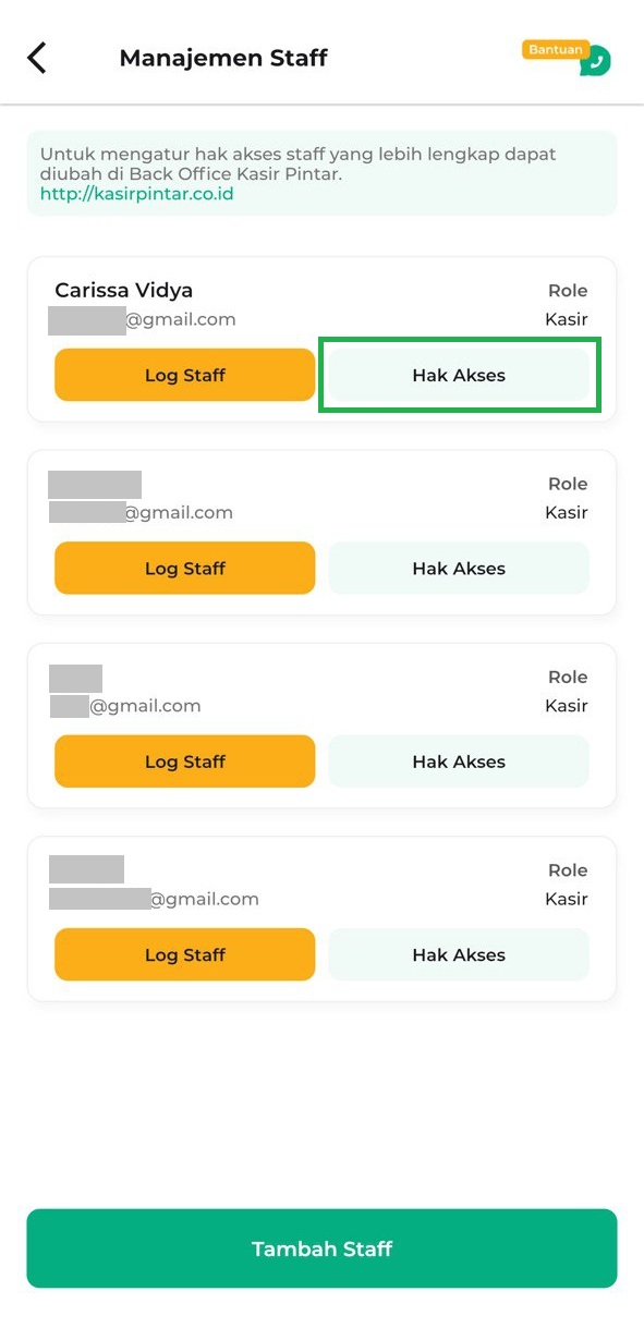 - Pilih nama staff yang ingin diatur hak akses draft pembelian. Lalu, klik tombol Hak Akses.