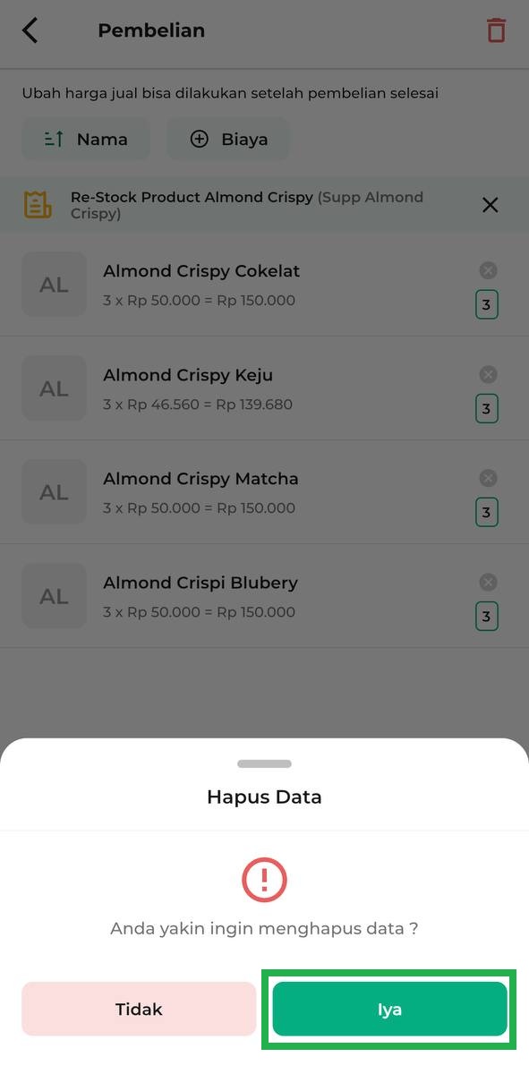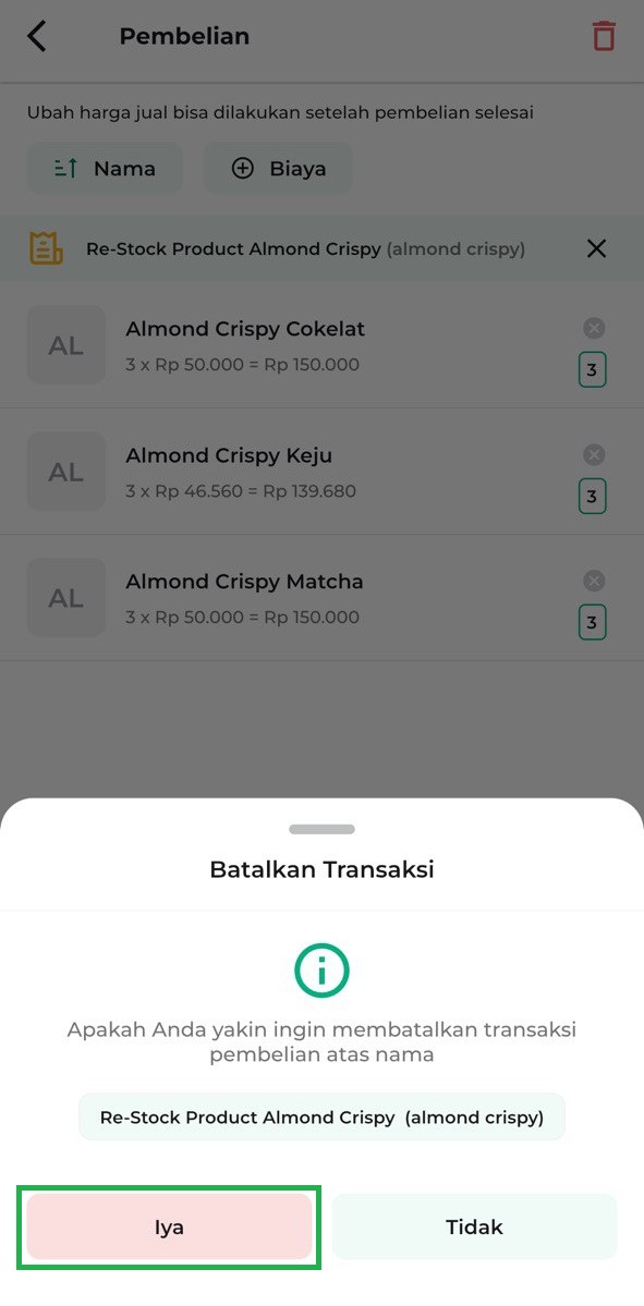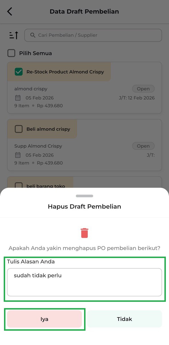- Lalu, klik Iya untuk mengkonfirmasi pembatalan draft pembelian.