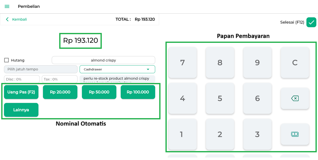- Masukkan nominal uang yang dibayarkan ke supplier dengan cara manual melalui papan pembayaran atau pilih opsi bayar yang telah disediakan oleh sistem.
