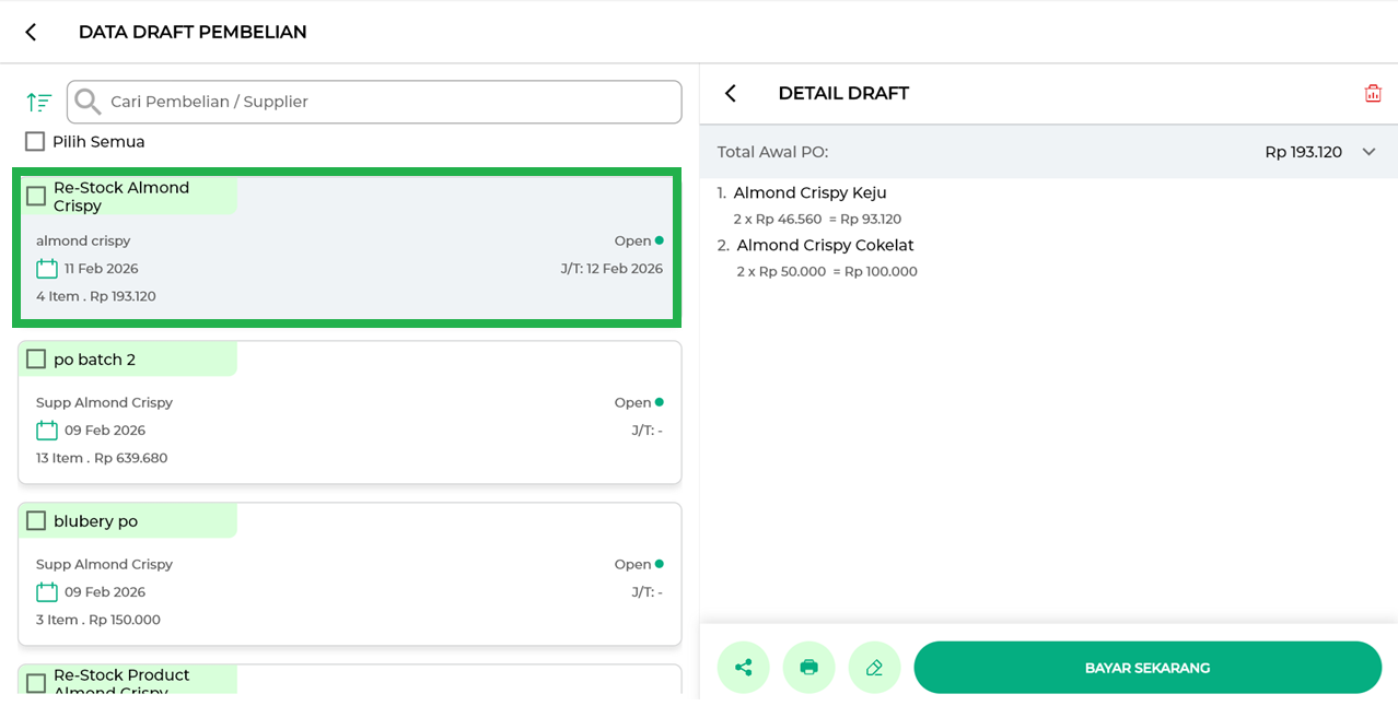 - Pilih dan klik langsung data draft pembelian yang ingin dibagikan, diubah, dan dicetak.
