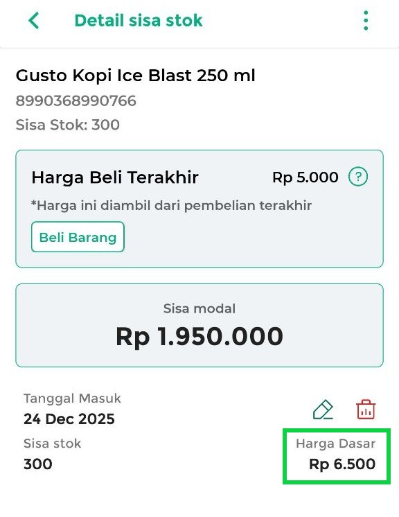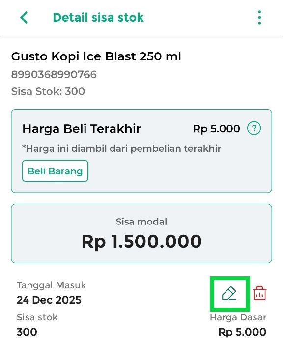 - Pilih sisa stok yang harga dasarnya ingin diubah, lalu klik ikon pensil di sampingnya.