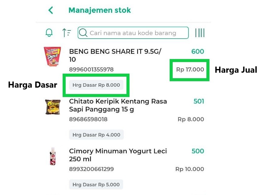 Di halaman Manajemen Stok, Anda akan melihat dua jenis harga :