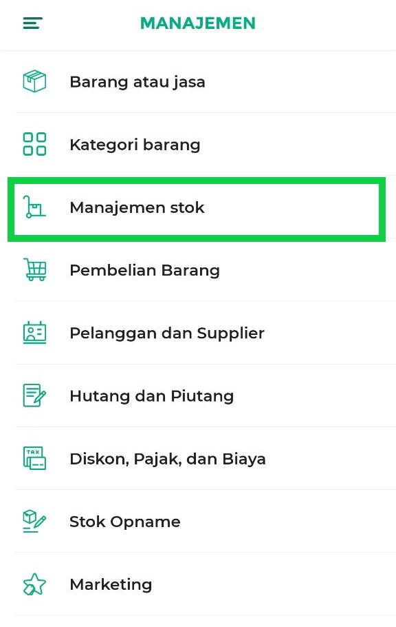 Fitur Manajemen Stok digunakan untuk melakukan penyesuaian stok secara manual. Perubahan stok melalui fitur ini tidak tercatat di laporan, sehingga sebaiknya hanya digunakan dalam kondisi tertentu atau darurat, seperti saat terjadi kesalahan pencatatan stok.
