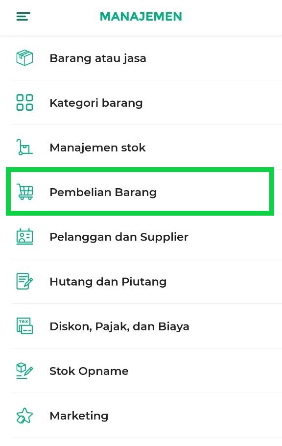Fitur Transaksi Pembelian digunakan untuk mencatat pembelian barang dari supplier sekaligus menambah stok barang. Cara ini paling disarankan karena setiap penambahan stok akan tercatat di laporan pembelian.