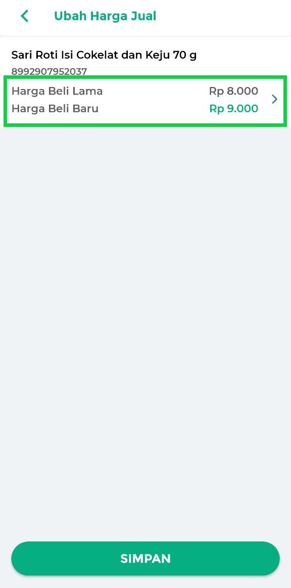 - Di halaman ini, tercantum informasi Harga Beli Lama dan Harga Beli Baru yang telah Anda atur, lalu klik ikon panah di sisi kanan.