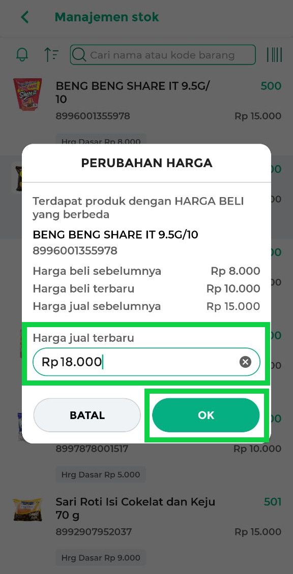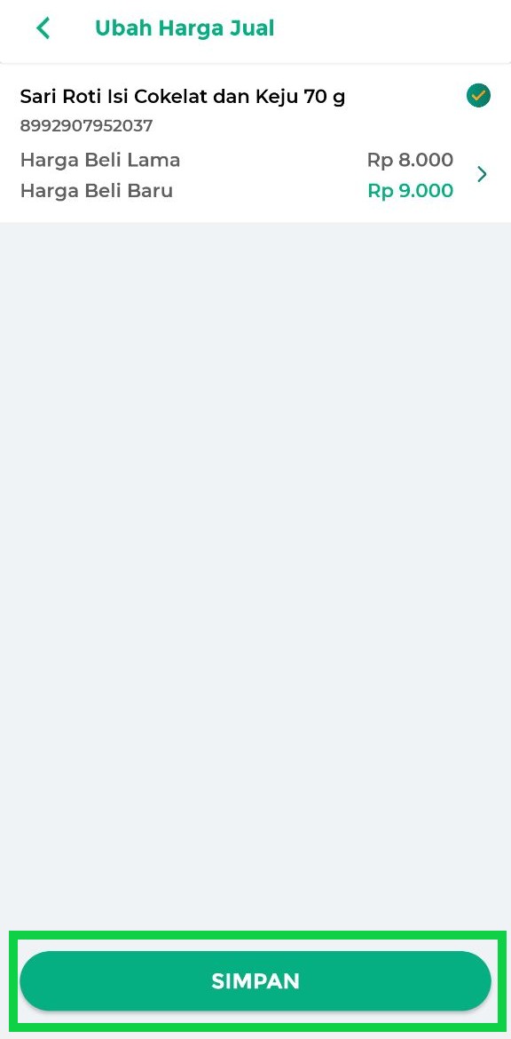 Setelah mengubah Harga Beli, sesuaikan Harga Jual agar margin keuntungan tetap terjaga. Caranya, klik tombol Ubah Harga di pojok kiri atas.