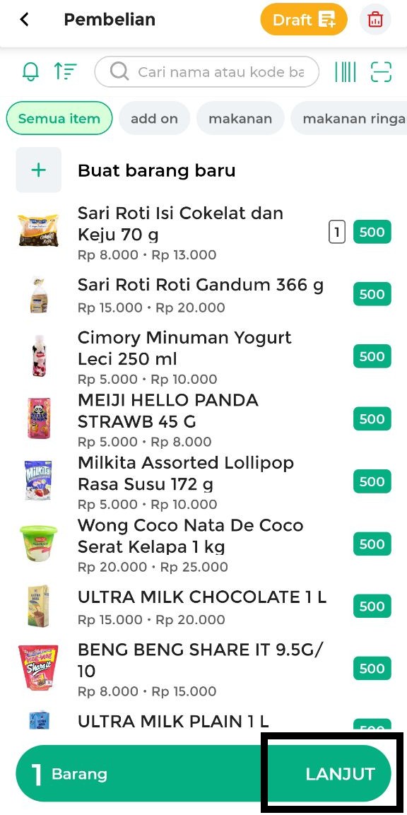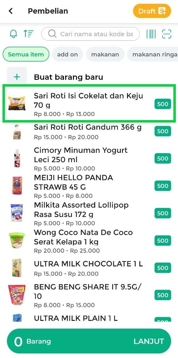 Saat membuat transaksi pembelian, Anda dapat mengubah Harga Beli barang sesuai dengan harga pasar saat ini.