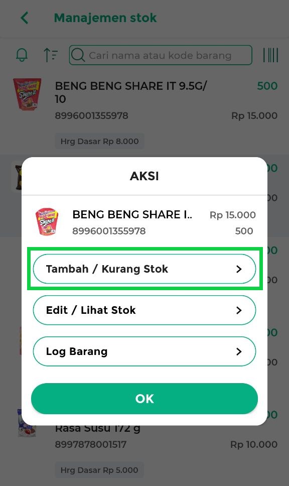 - Pilih opsi Tambah Stok atau Kurang Stok, sesuai kebutuhan Anda.