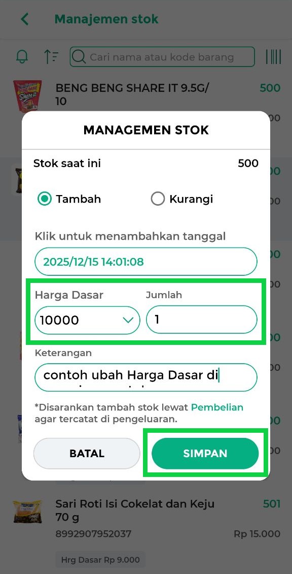 - Masukkan Harga Dasar terbaru serta jumlah stok yang ditambahkan atau dikurangkan, lalu klik Simpan.