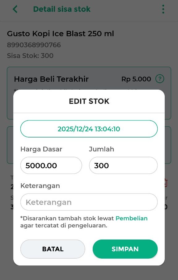 - Masukkan Harga Dasar terbaru serta jumlah stok yang ditambahkan atau dikurangkan, lalu klik Simpan.