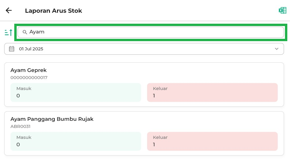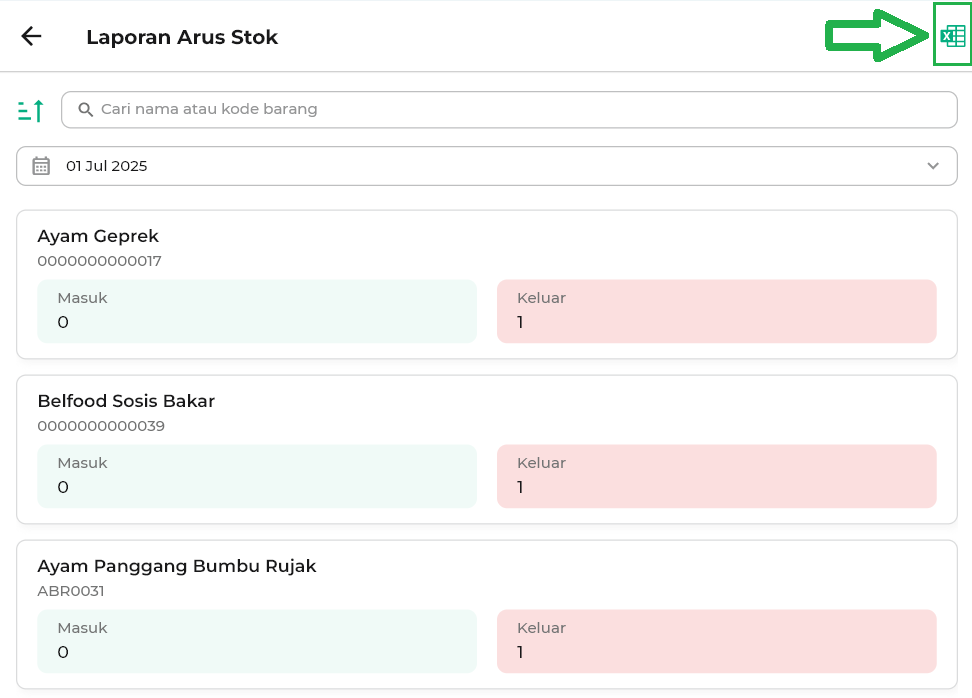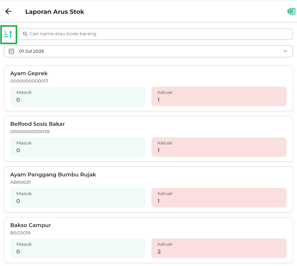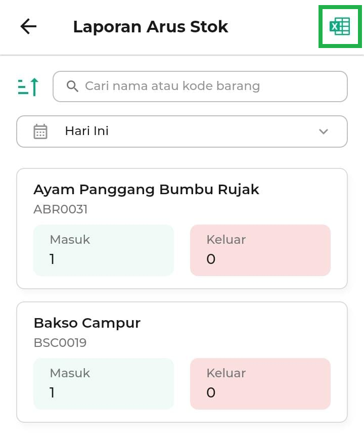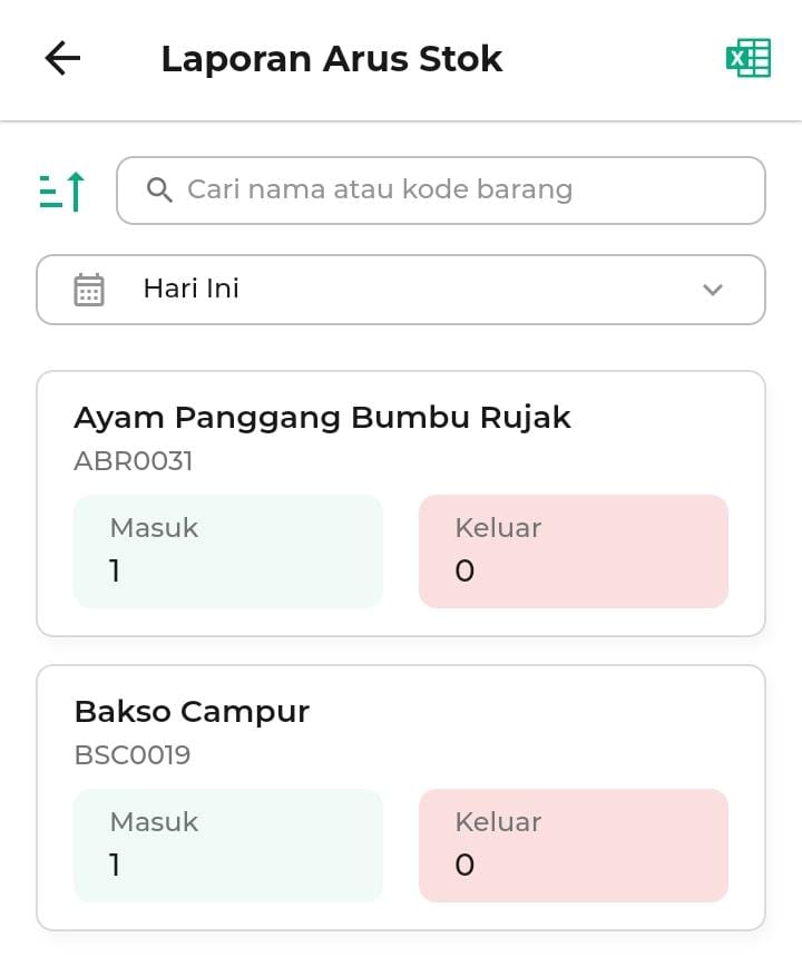 8. Anda dapat klik ikon Excel untuk mengunduh laporan arus stok. File ini dapat digunakan untuk arsip, analisis, atau kebutuhan pelaporan internal toko Anda.