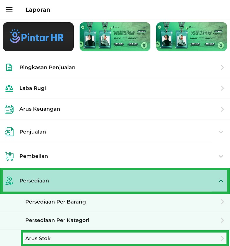Cara mengakses laporan arus stok di Kasir Pintar Pro dan Kasir Pintar Dashboard pada dasarnya sama. Namun, contoh tampilan pada panduan ini menggunakan Kasir Pintar Dashboard (iOS).