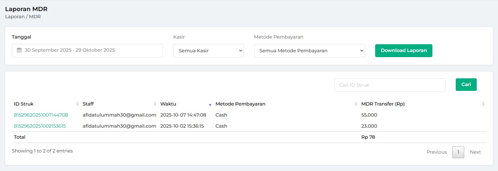 Sementara itu, kategori MDR menampilkan potongan biaya dari transaksi non-tunai yang diproses melalui metode pembayaran digital, sehingga Anda dapat memantau total potongan yang dikenakan secara lebih akurat.