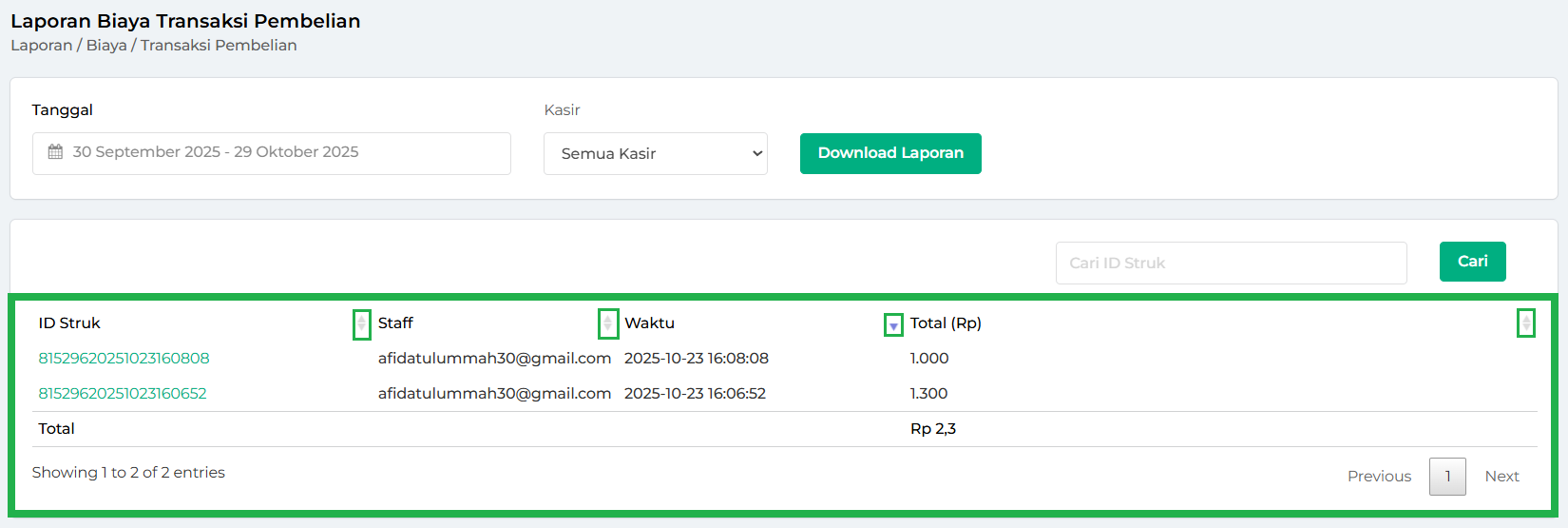 7. Terdapat tabel yang berisi seluruh laporan biaya transaksi pembelian.