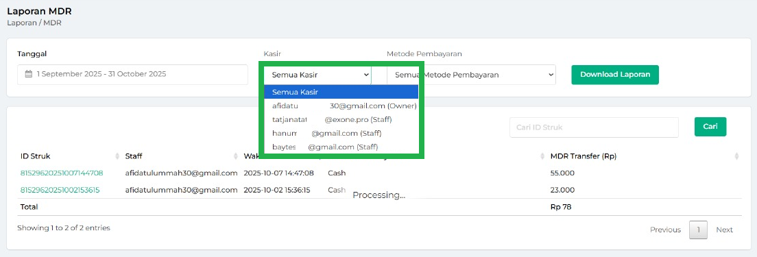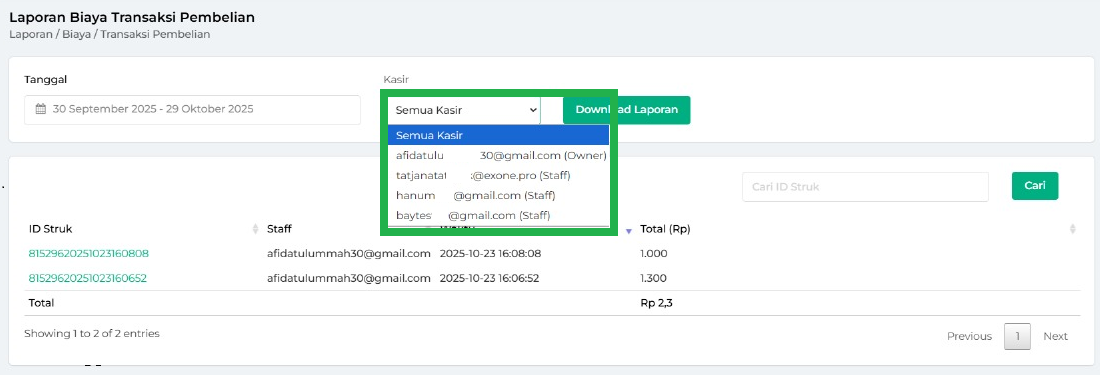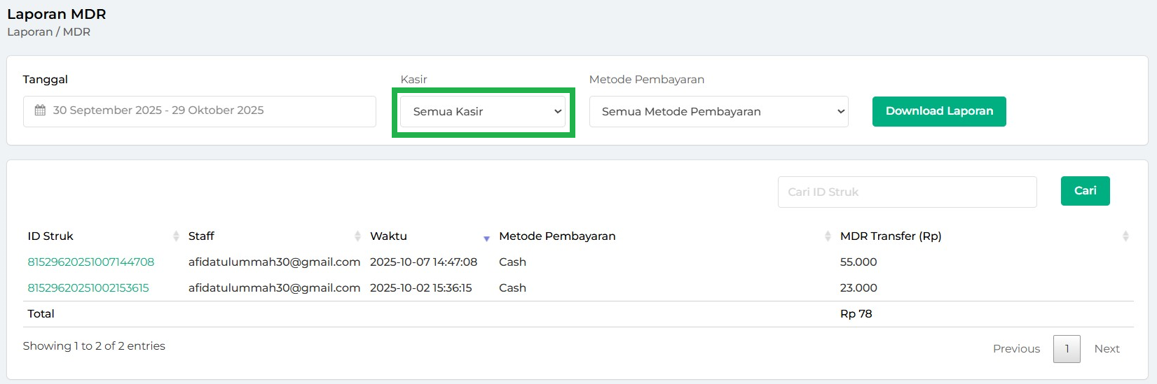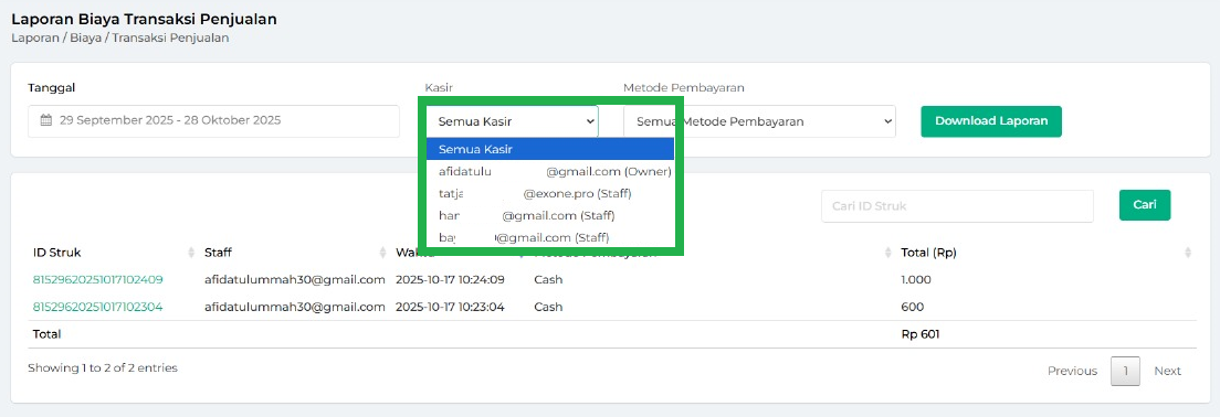 5. Pada filter Kasir, Anda dapat memilih untuk melihat laporan dari owner, semua kasir, atau staf kasir tertentu.