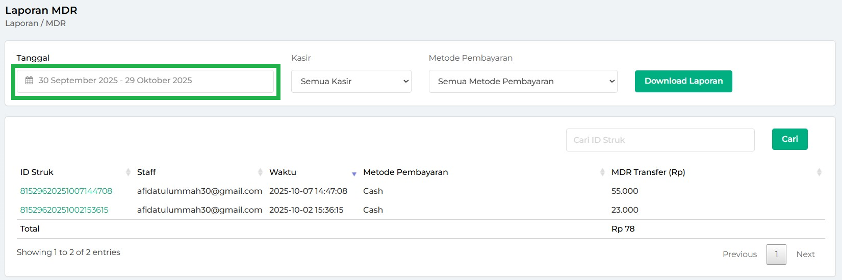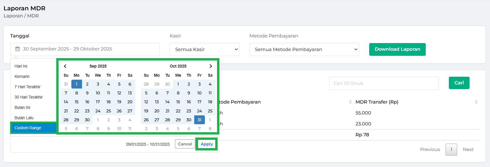 • Custom Tanggal: pilih sendiri jangka waktu laporan MDR sesuai kebutuhan, setelah itu klik Apply agar rentang waktu dapat diterapkan.