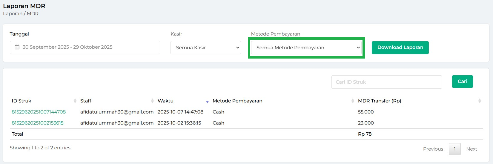 Anda dapat memilih untuk menampilkan laporan yang menggunakan semua metode pembayaran atau metode pembayaran tertentu.