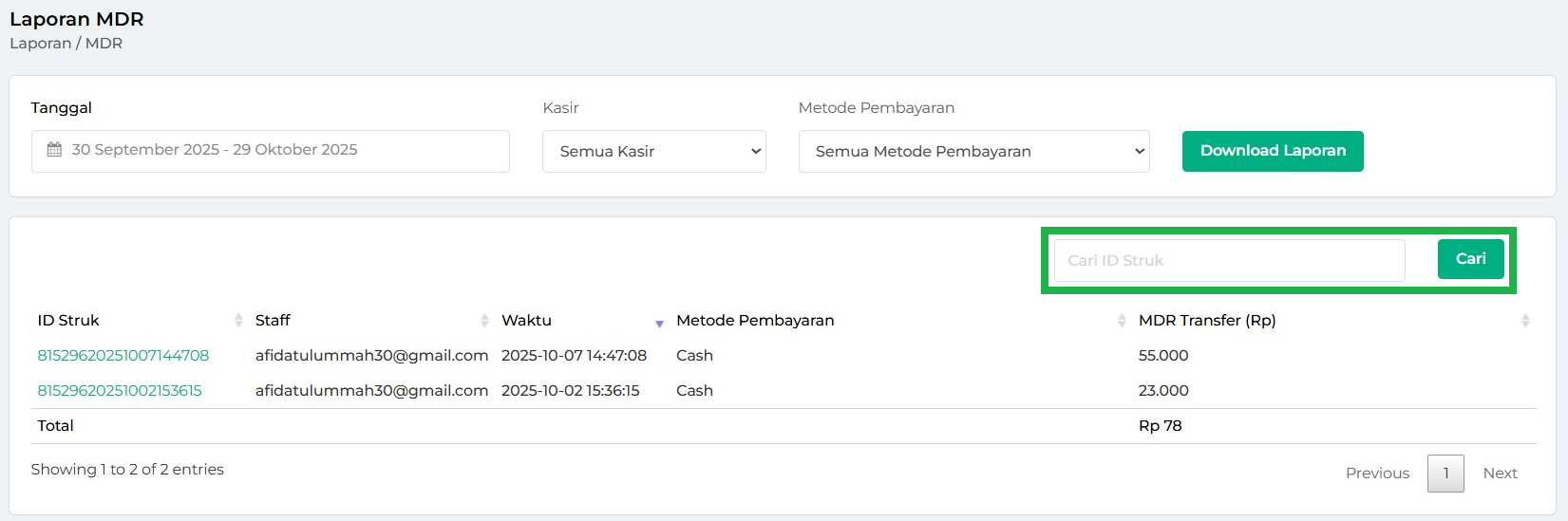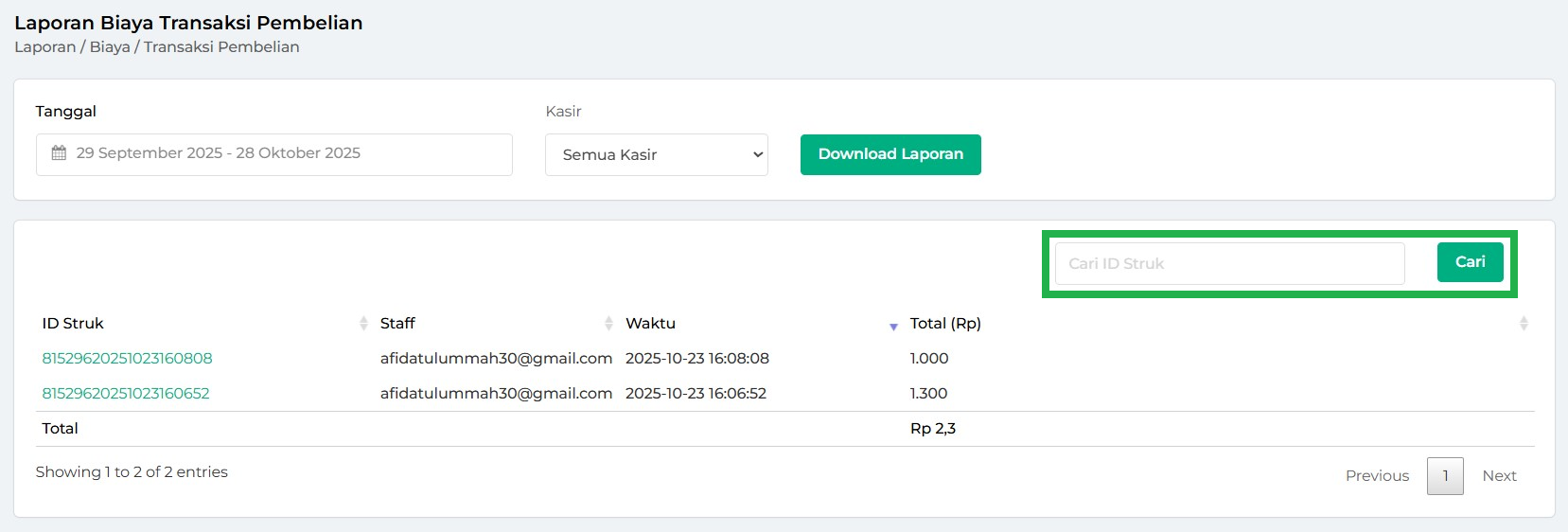 8. Gunakan fitur Cari ID Struk untuk menemukan transaksi tertentu berdasarkan kode struk.