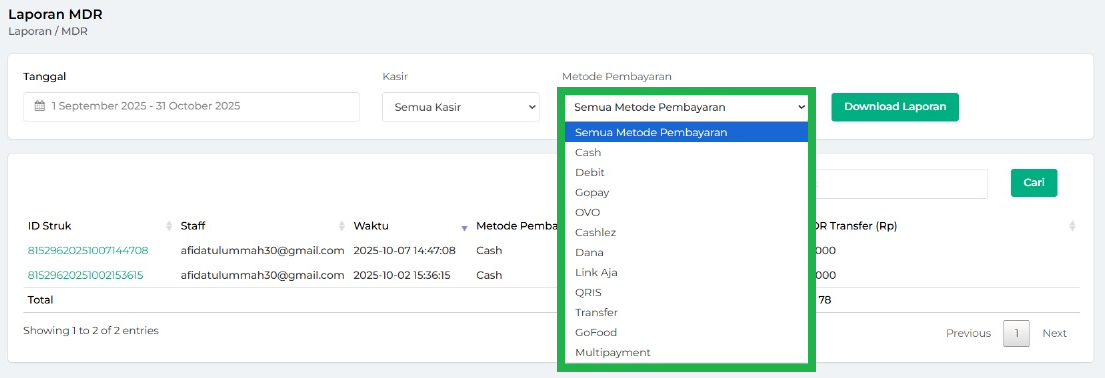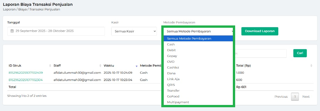 6. Pilih filter metode pembayaran yang ingin ditampilkan pada laporan.