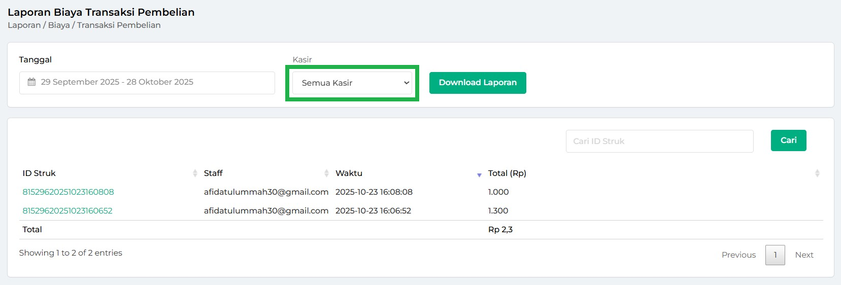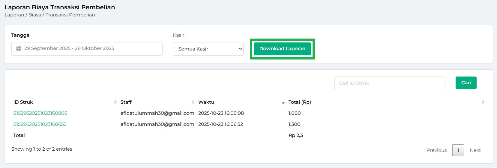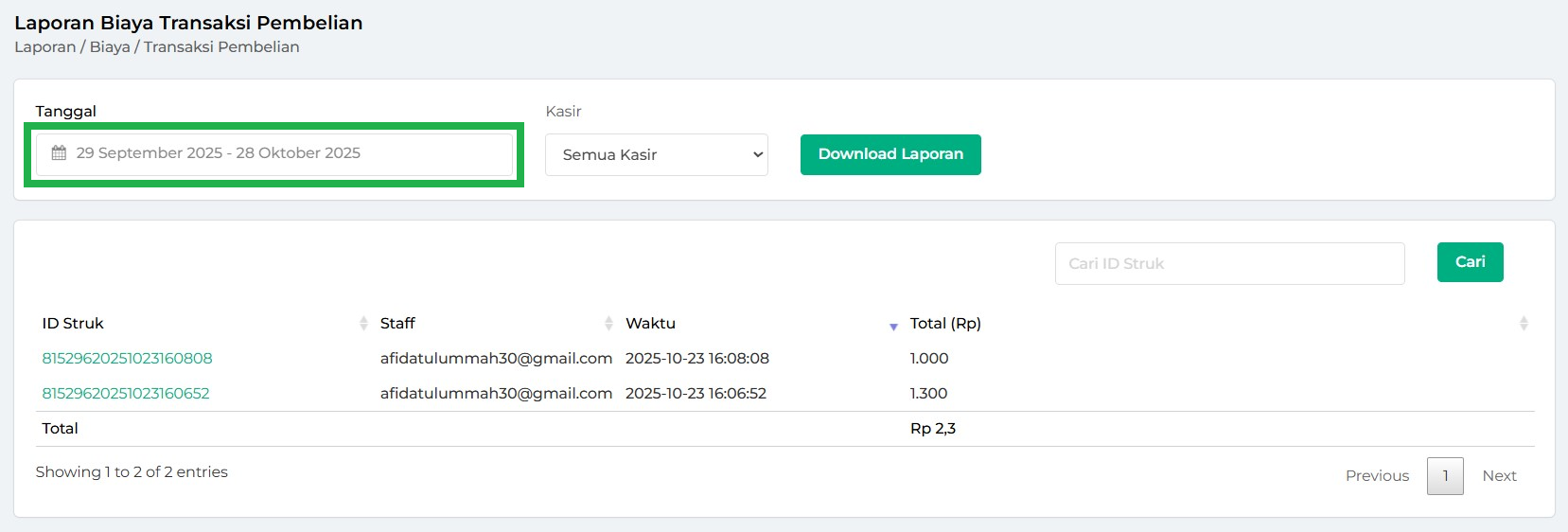 3. Anda akan diarahkan ke halaman Laporan Biaya Transaksi Pembelian.