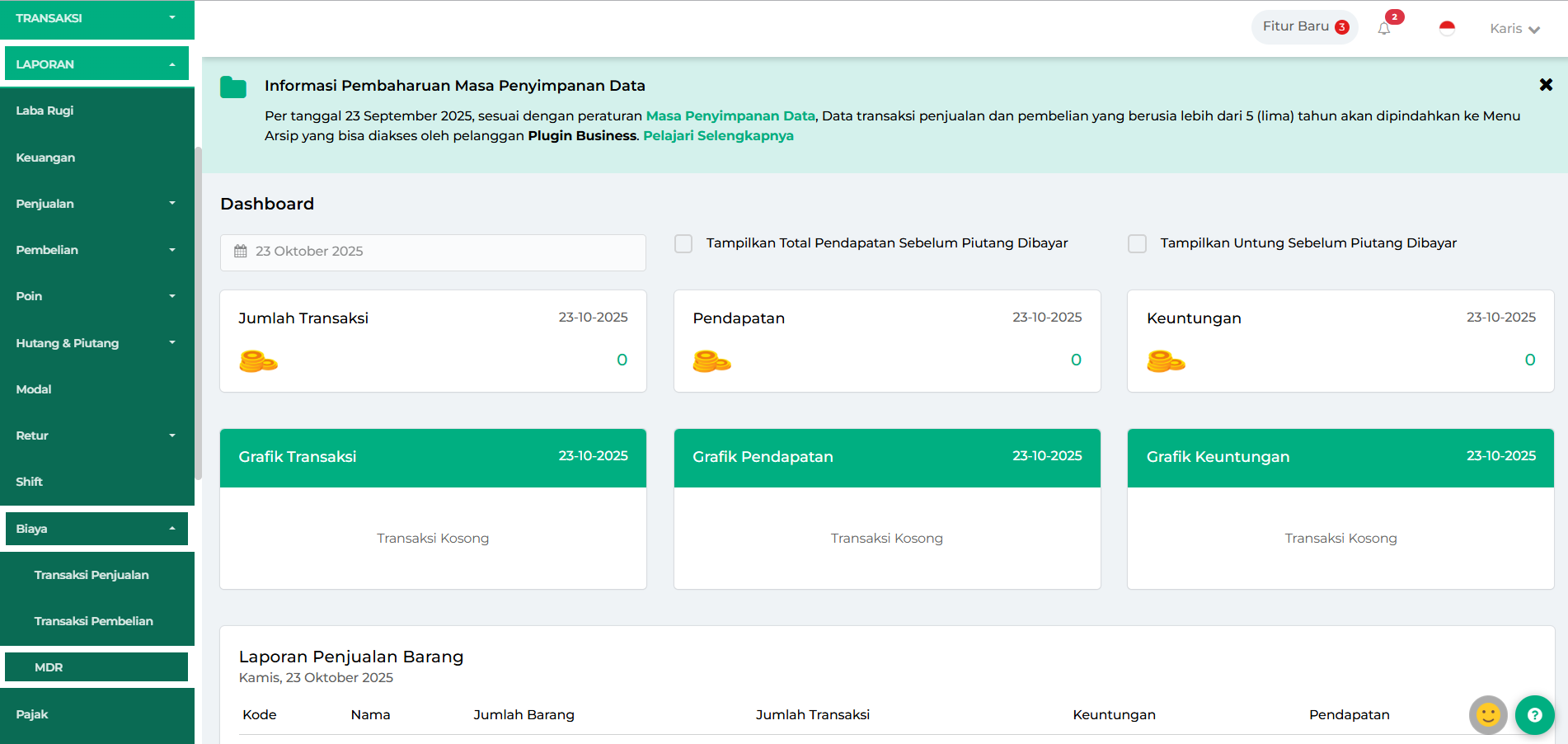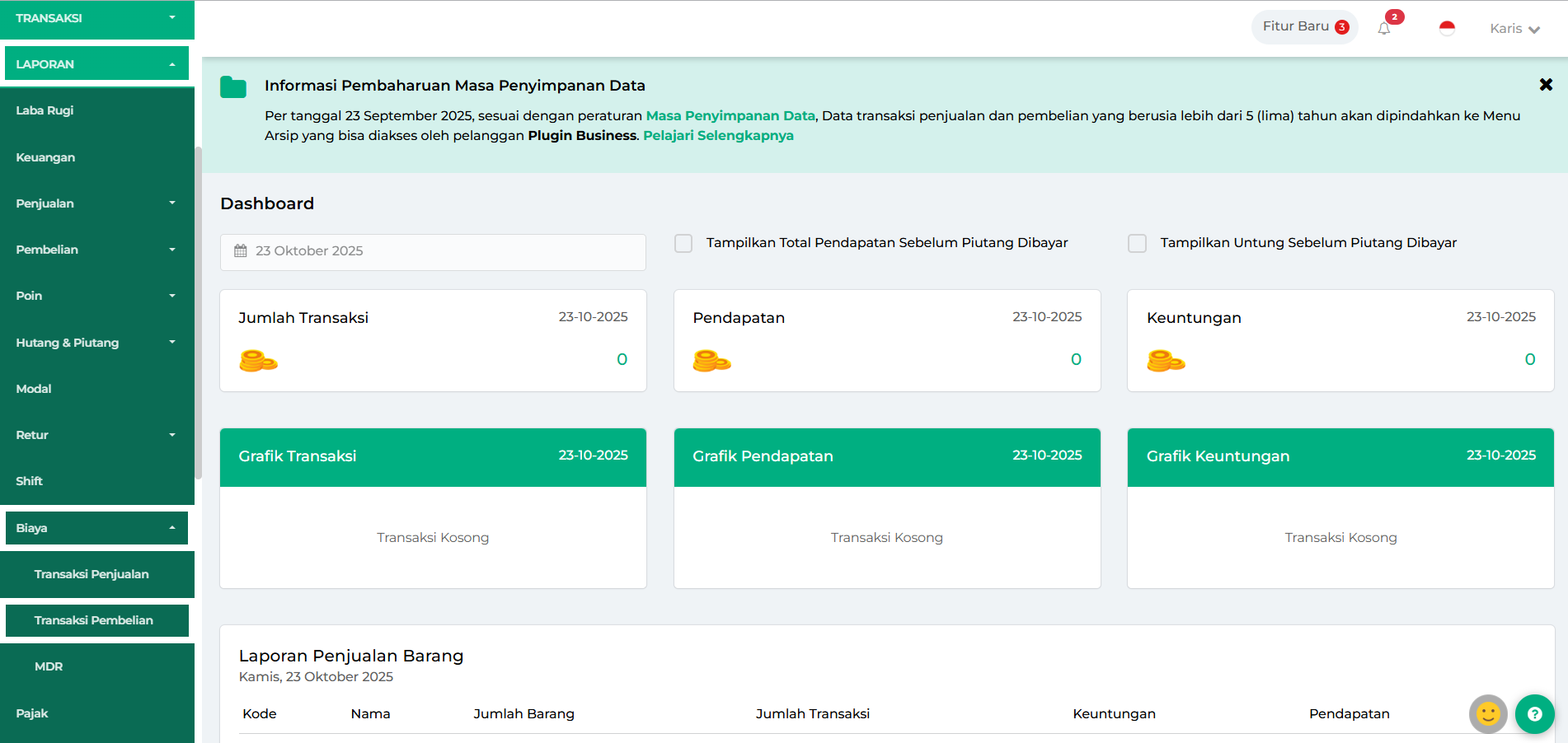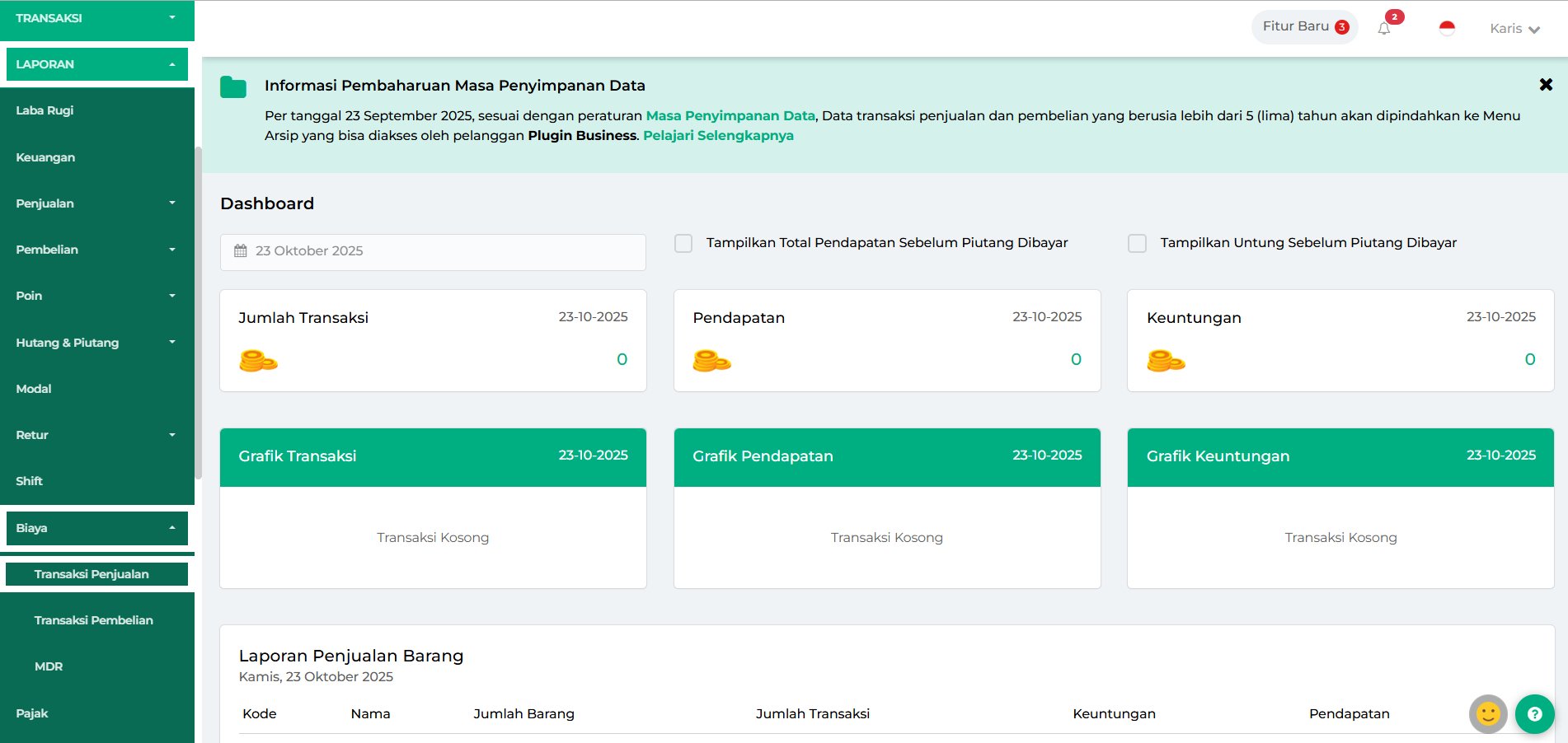 2. Pilih menu Laporan → Biaya Transaksi Penjualan pada sidebar.