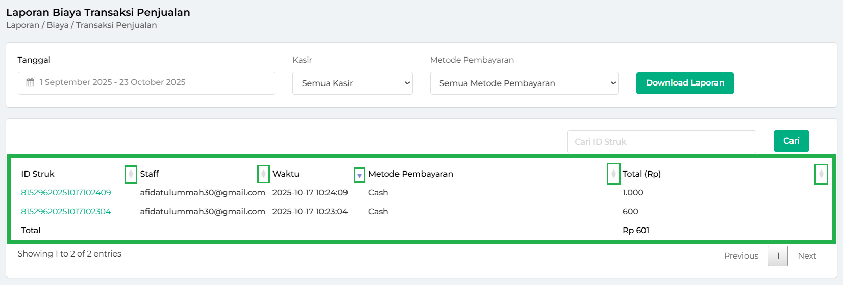 Jika diperlukan, Anda dapat mengurutkan laporan secara ascending (dari kecil ke besar atau awal ke akhir) maupun descending (dari besar ke kecil atau akhir ke awal) melalui ikon panah di samping nama kolom.
