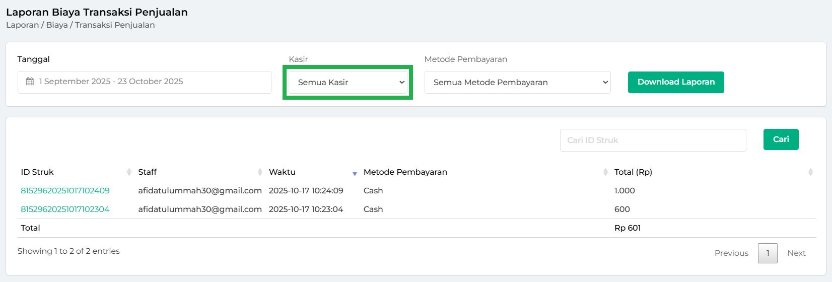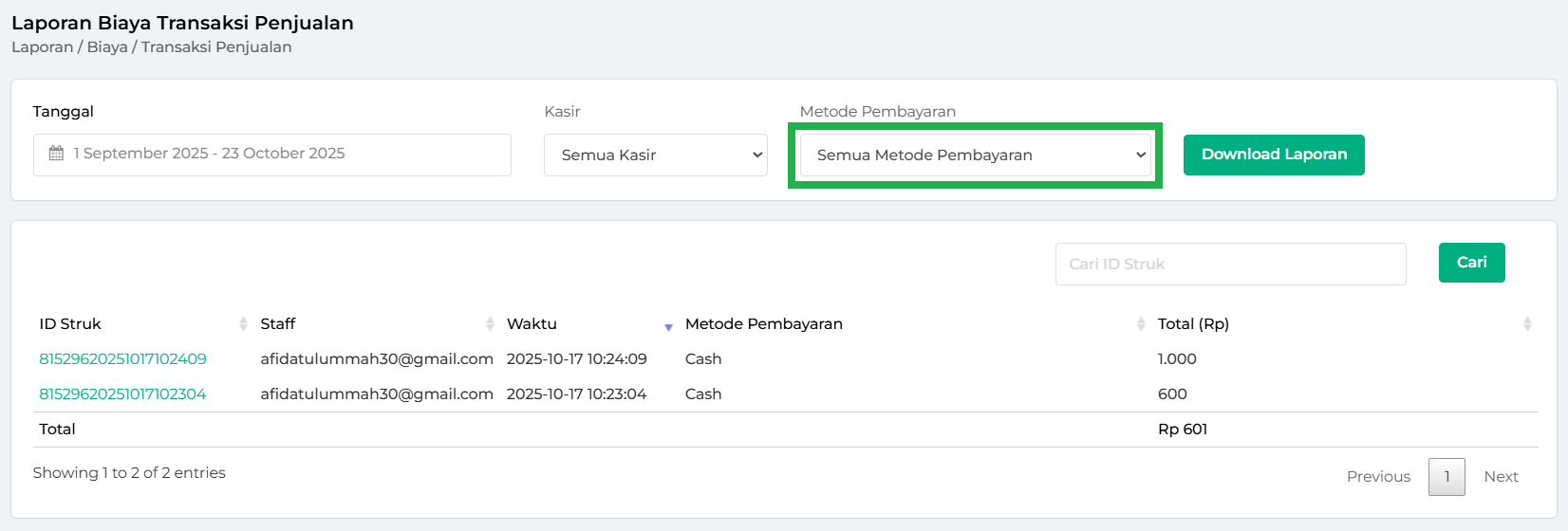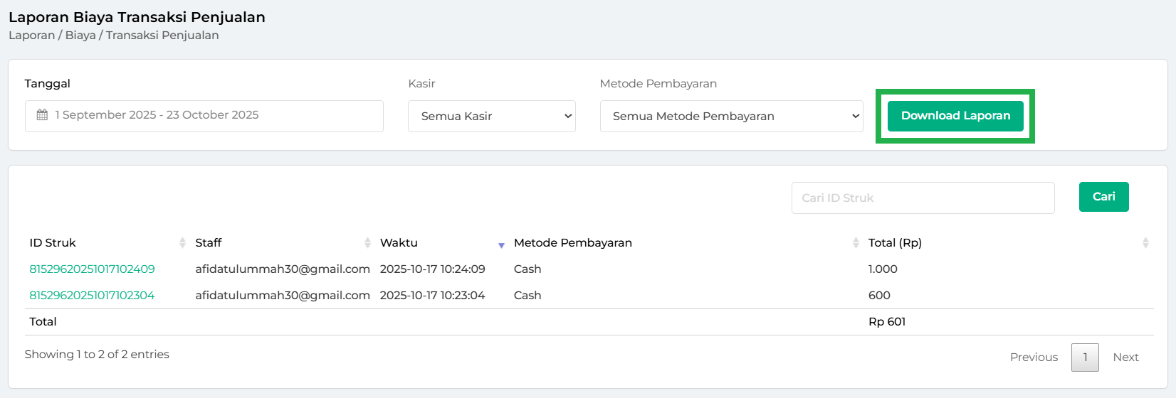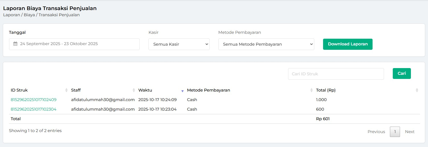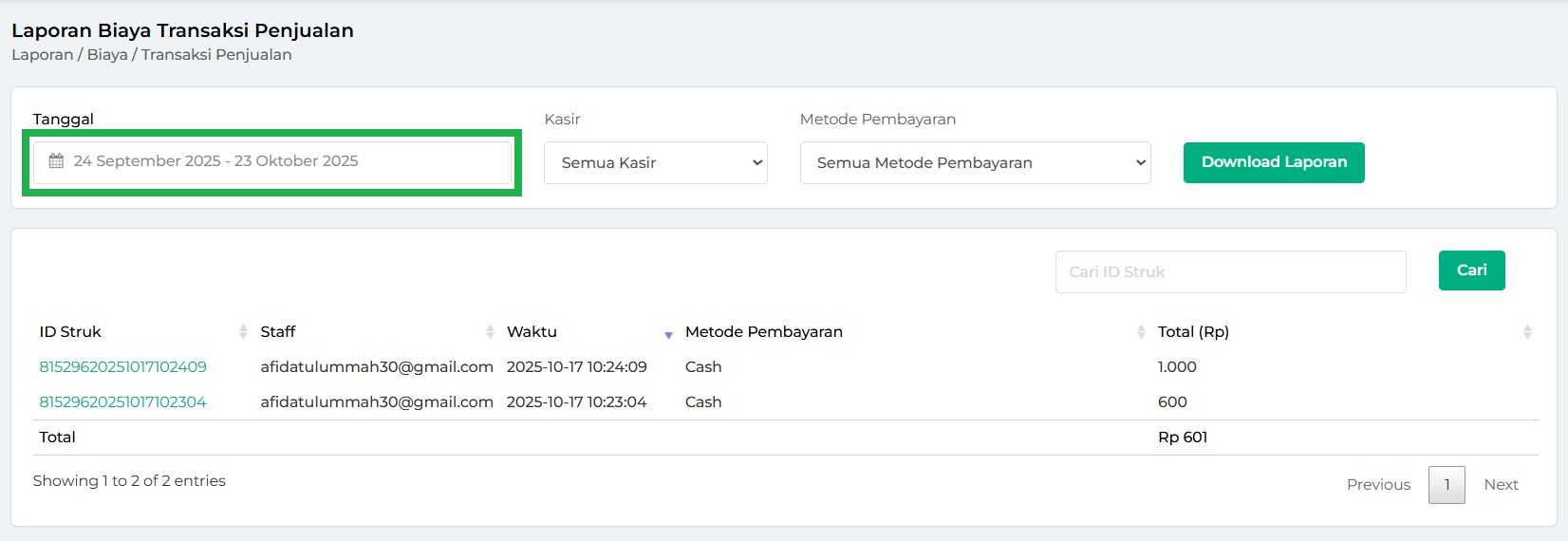 3. Anda akan diarahkan ke halaman Laporan Biaya Transaksi Penjualan.
