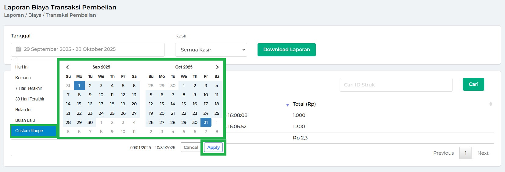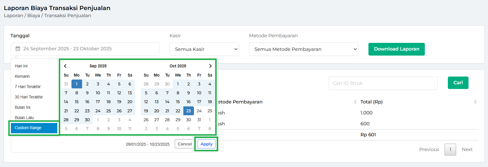 • Custom Tanggal: pilih sendiri jangka waktu laporan biaya transaksi sesuai kebutuhan, setelah itu klik Apply agar rentang waktu dapat diterapkan.