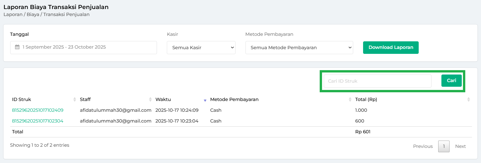 6. Gunakan fitur Cari ID Struk untuk menemukan transaksi tertentu berdasarkan kode struk.