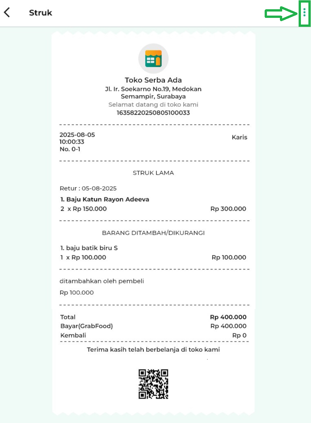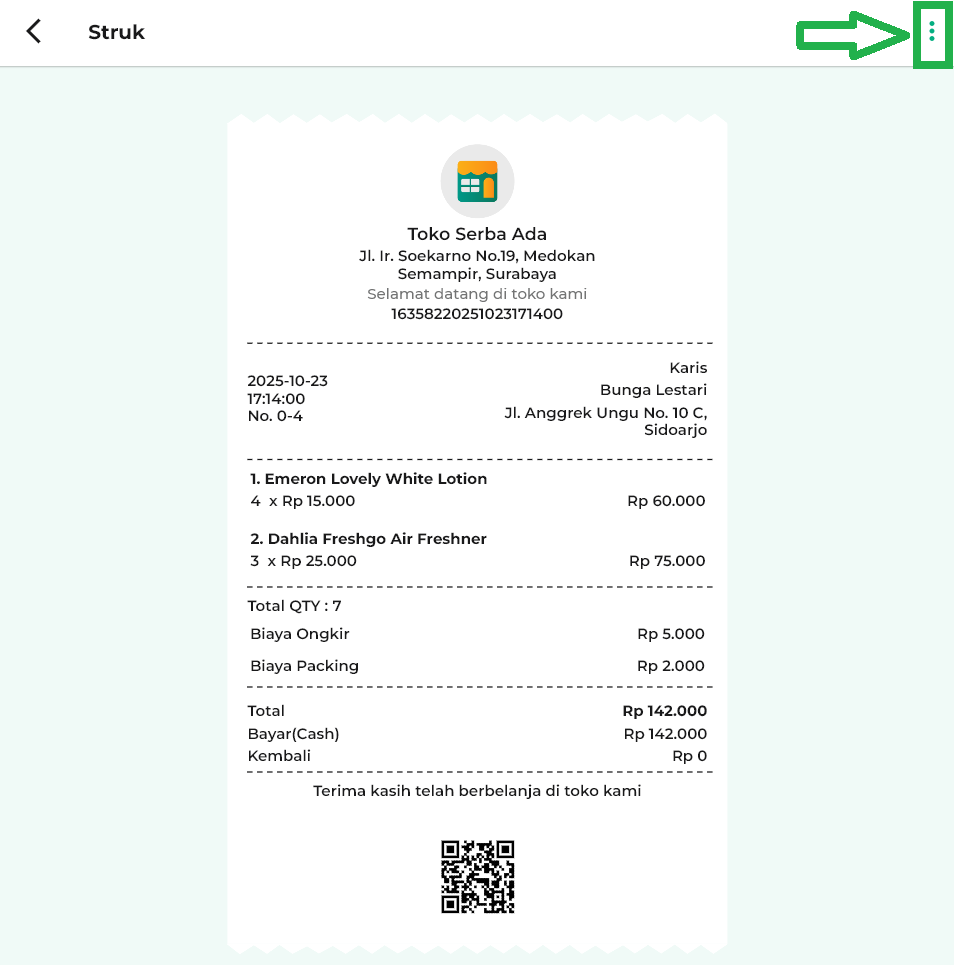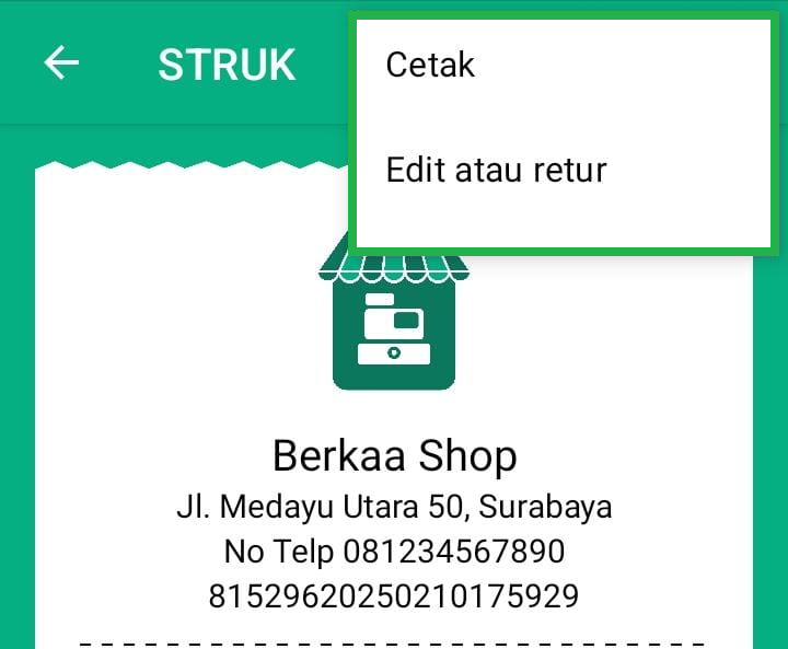- Ikon titik tiga: Membuka opsi fitur tambahan, seperti mencetak, mengedit, atau melakukan retur struk.
