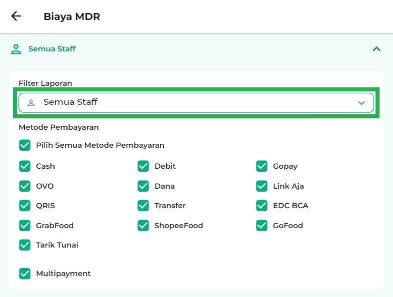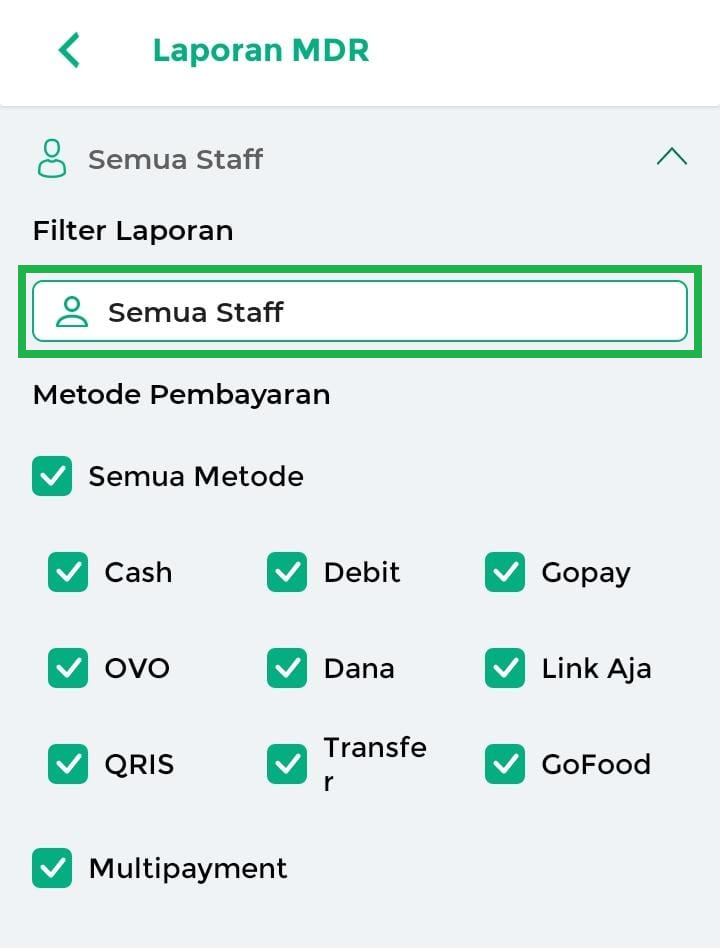 Pada bagian Filter Laporan, pilih Staff yang ingin ditampilkan.