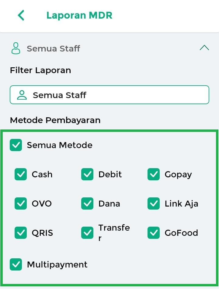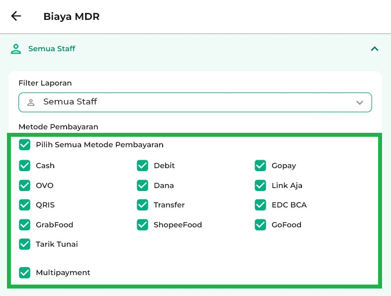 Sementara itu, kategori MDR menampilkan potongan biaya dari transaksi non-tunai yang diproses melalui metode pembayaran digital, sehingga Anda dapat memantau total potongan yang dikenakan secara lebih akurat.