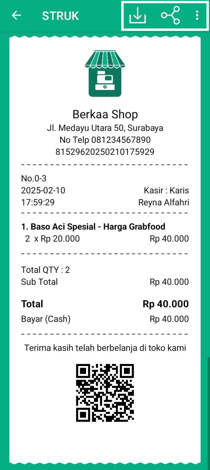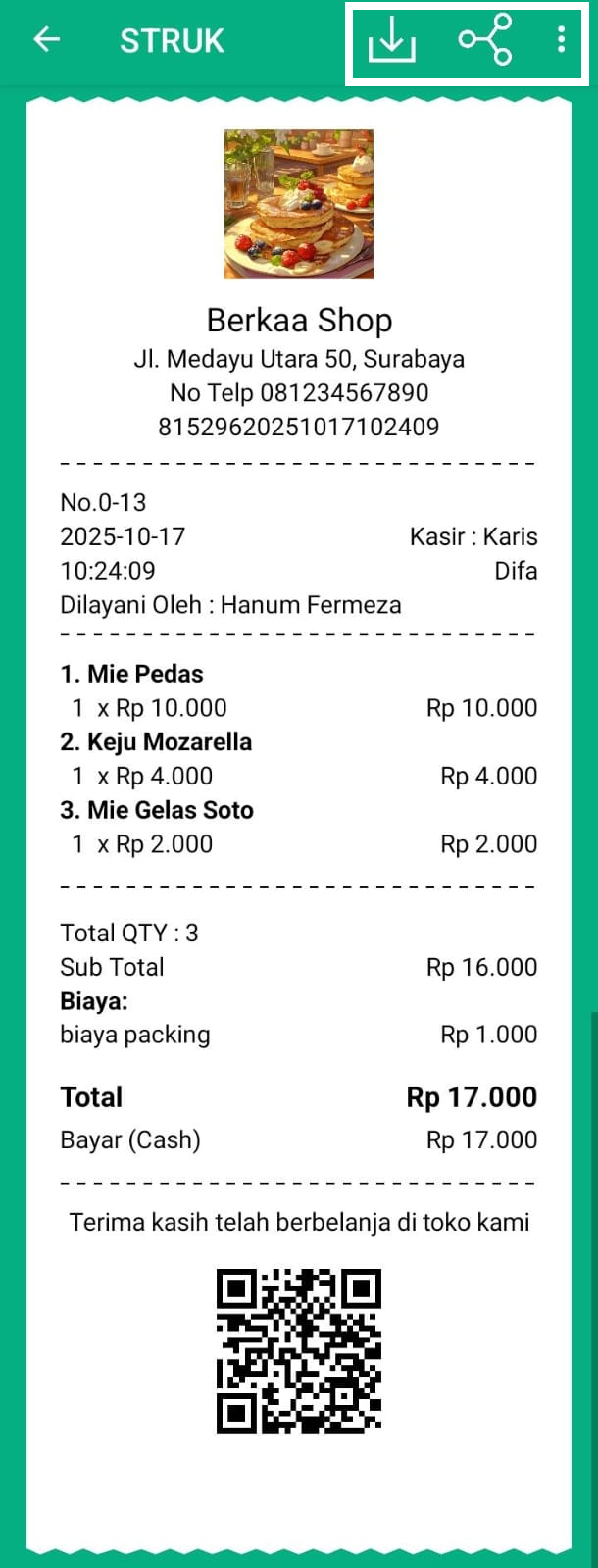 - Bagikan: Membagikan struk kepada pelanggan atau pihak terkait.