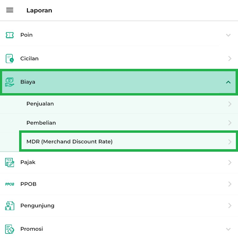 3. Klik opsi Laporan Biaya → MDR (Merchant Discount Rate) pada halaman laporan.
