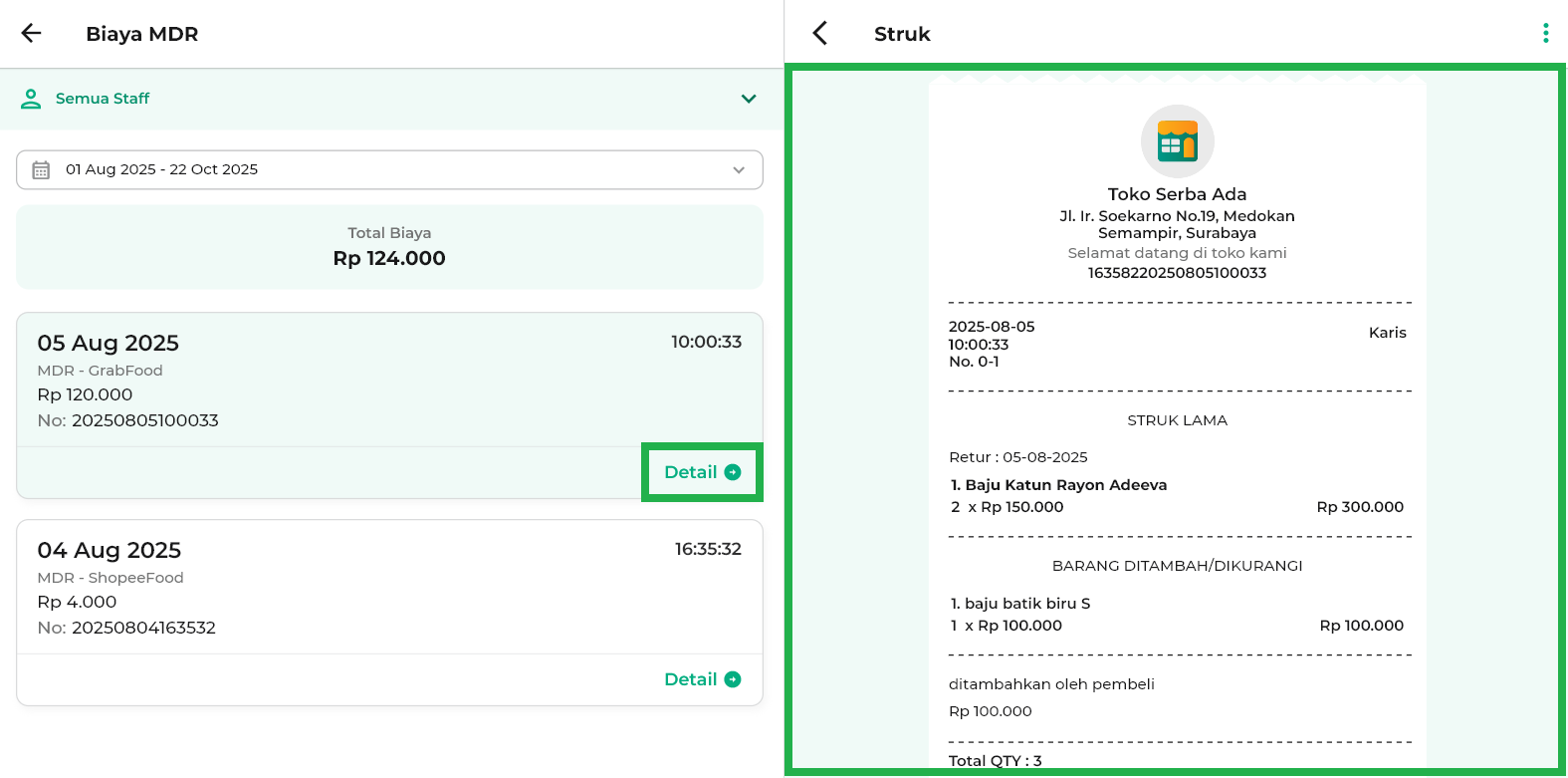 9. Untuk melihat detail transaksi MDR, klik tombol Detail dan struk transaksi akan muncul di halaman samping (sidebar kanan).