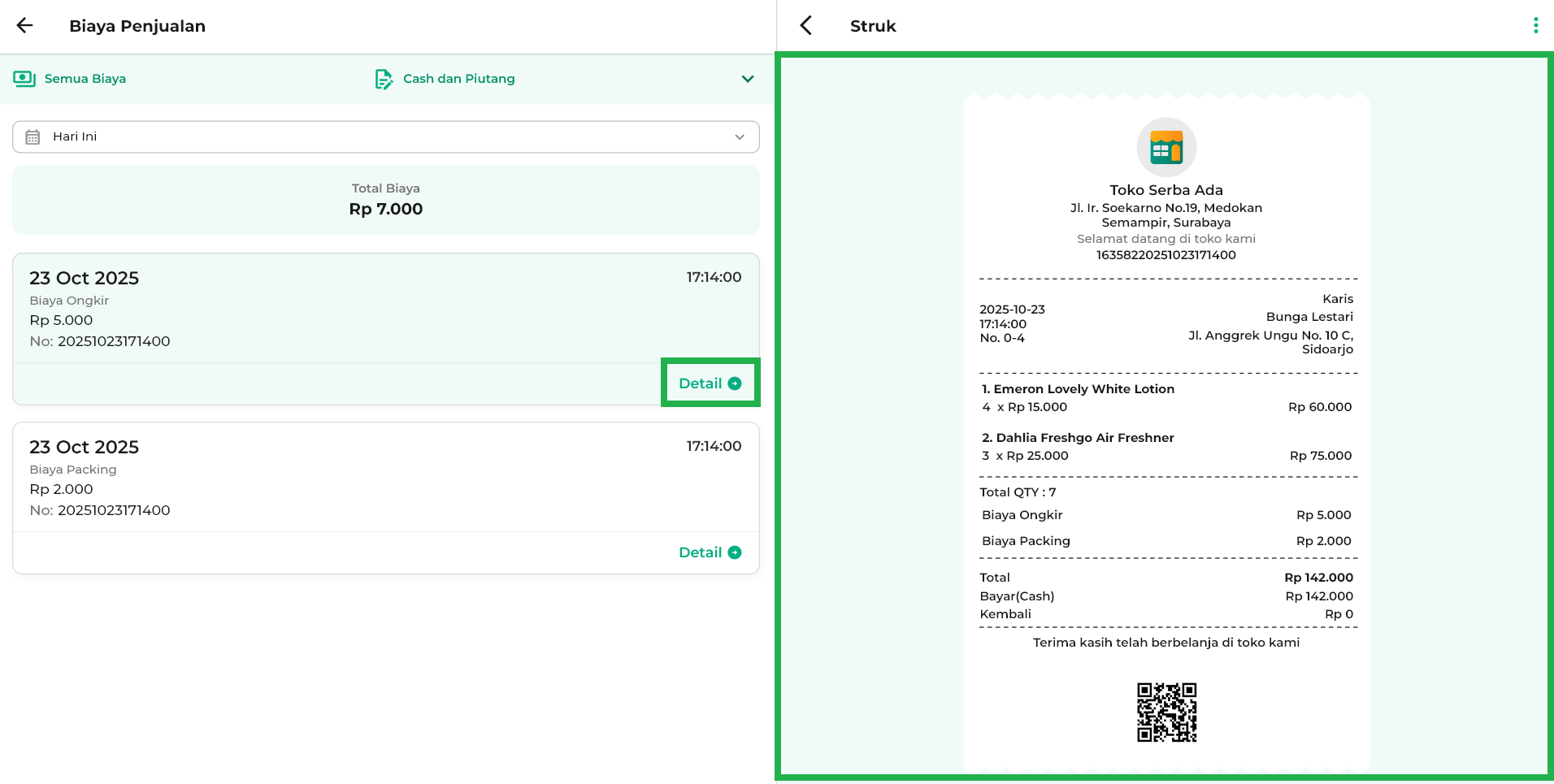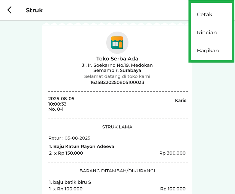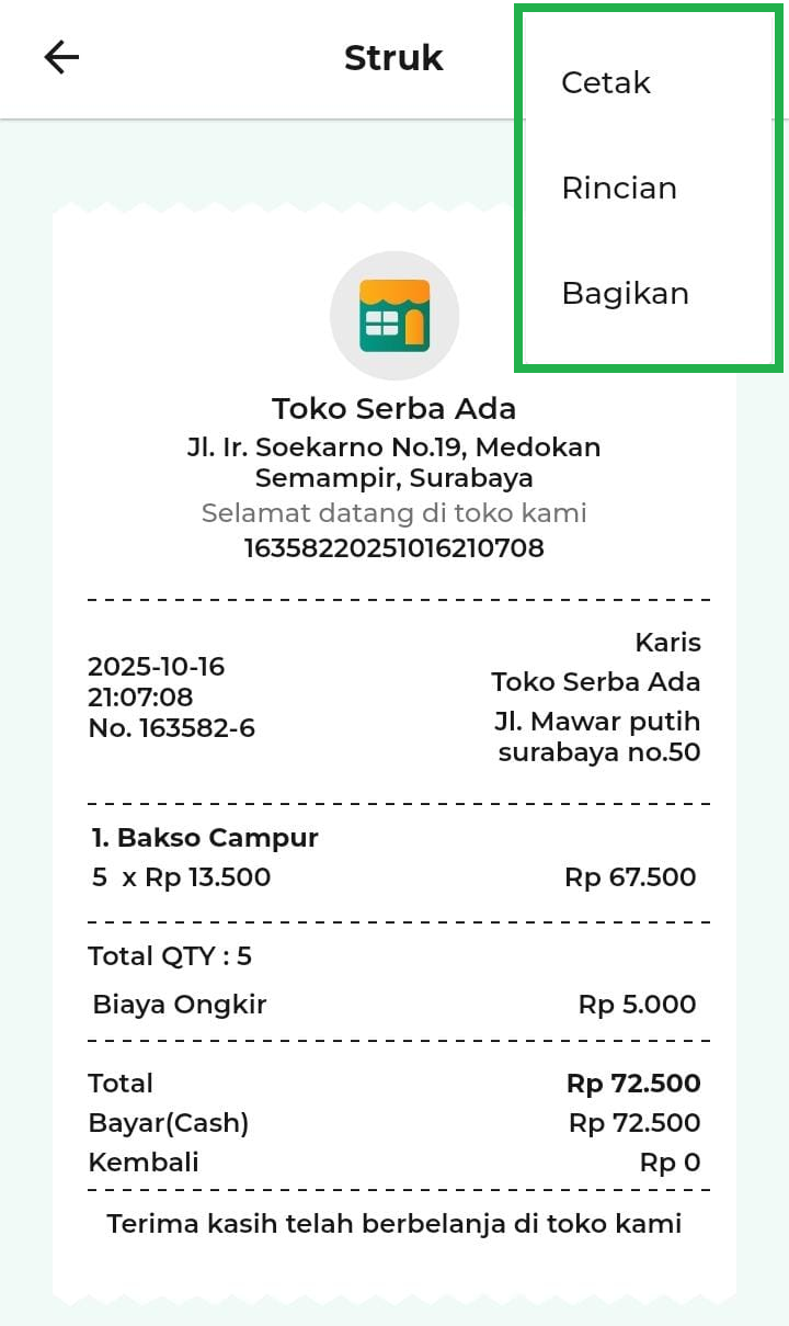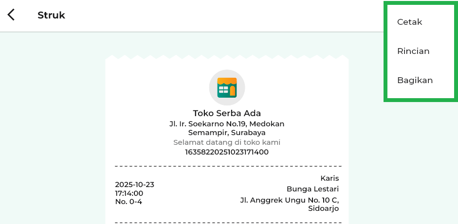 - Bagikan: untuk membagikan detail struk kepada pihak lain.