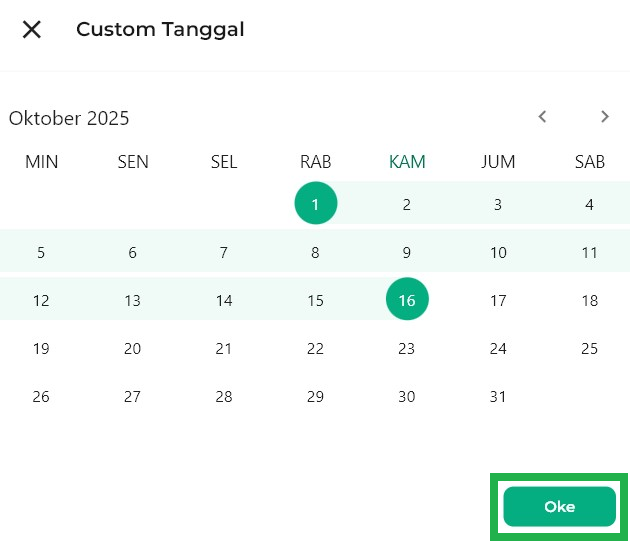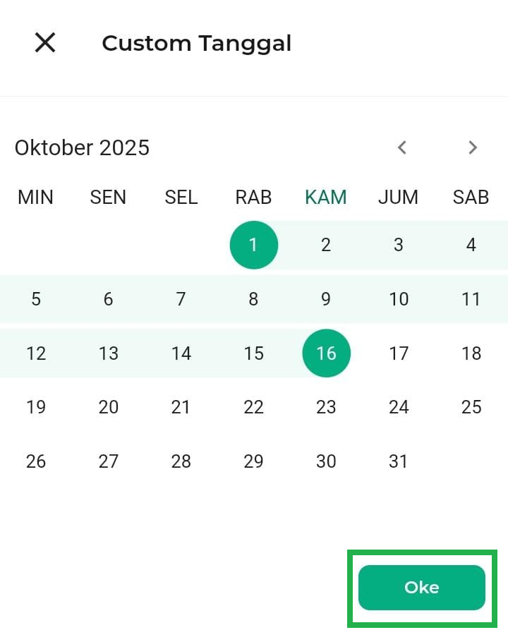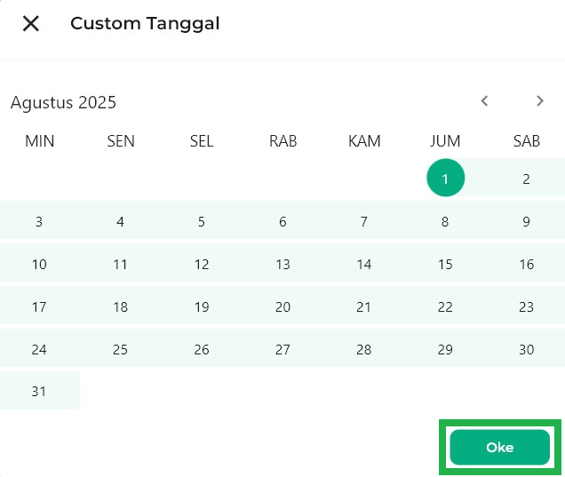 Jika Anda memilih Custom Tanggal, Anda dapat memilih jangka waktu periode berdasarkan keinginan Anda. Setelah itu klik OKE.