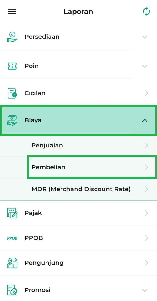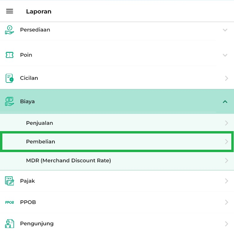 3. Klik opsi Laporan Biaya → Pembelian pada halaman laporan.
