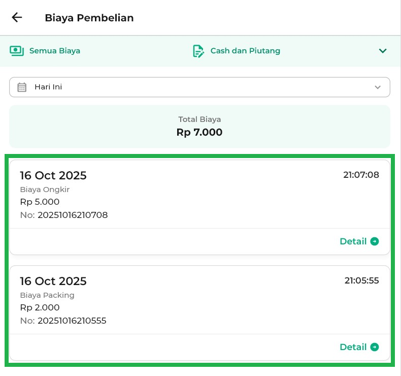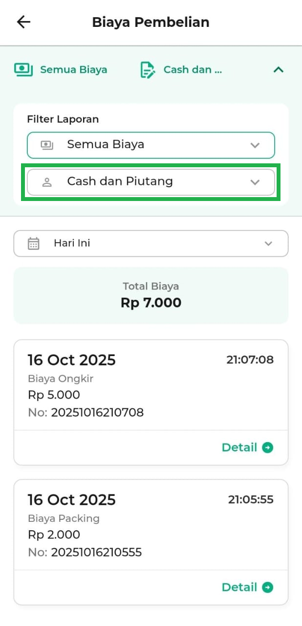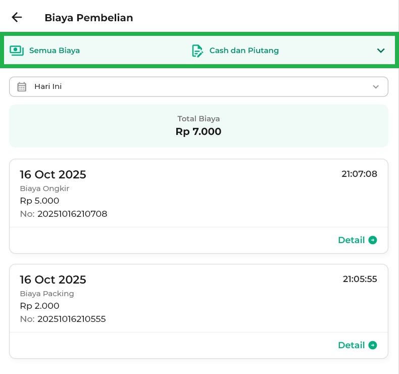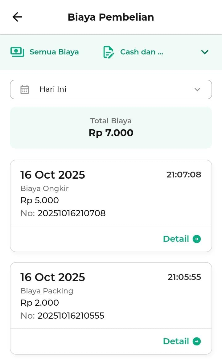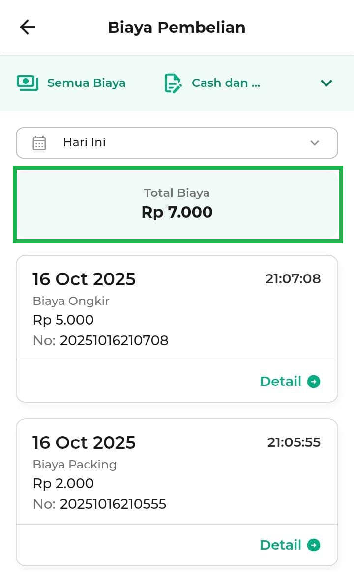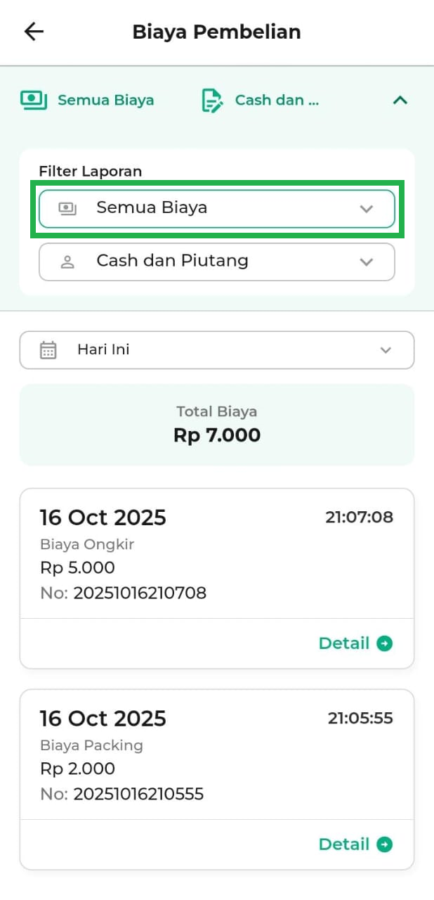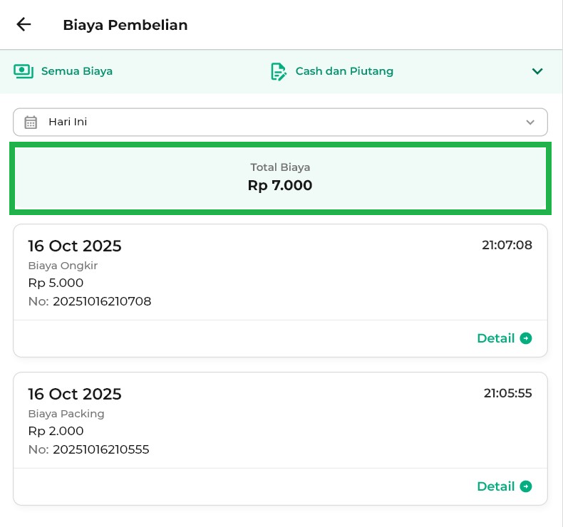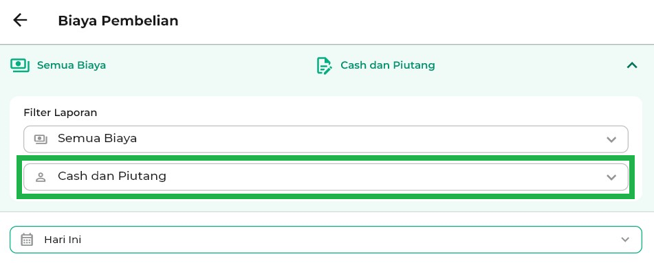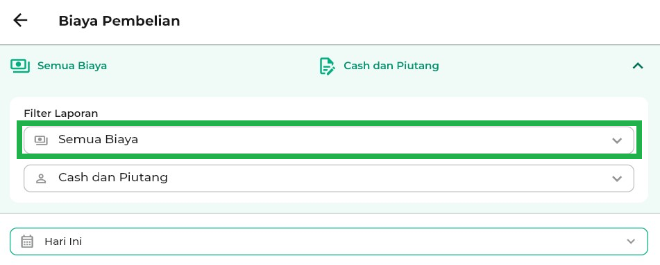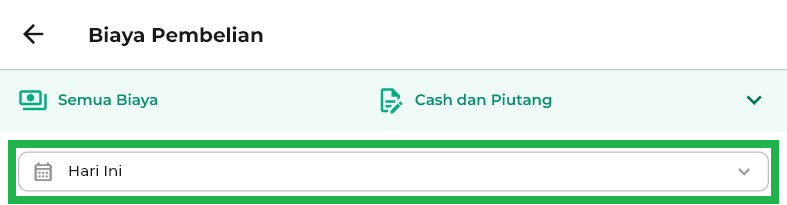 - Hari Ini: menampilkan biaya pembelian hari ini.