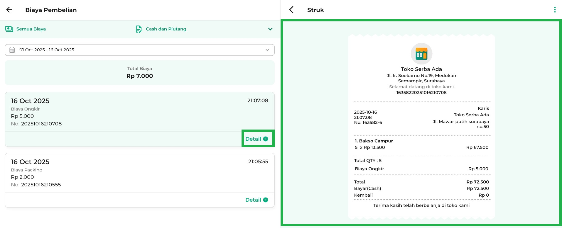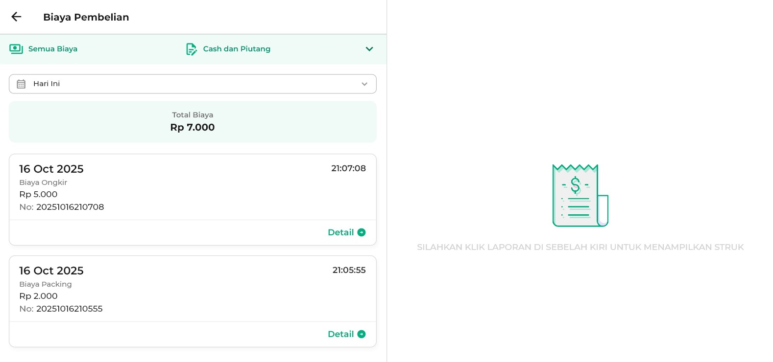 11. Untuk melihat detail transaksi pembelian, klik tombol Detail dan struk transaksi akan muncul di halaman samping (sidebar kanan).