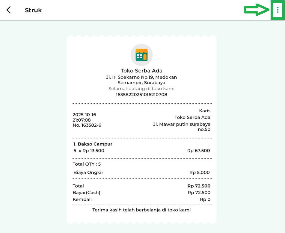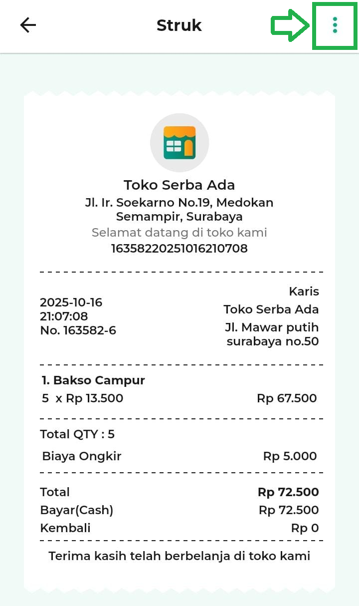 - Ikon titik tiga: untuk membuka opsi fitur tambahan pada struk.