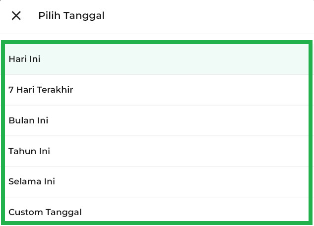 - Tunai: Menampilkan transaksi yang dibayar tunai (lunas).