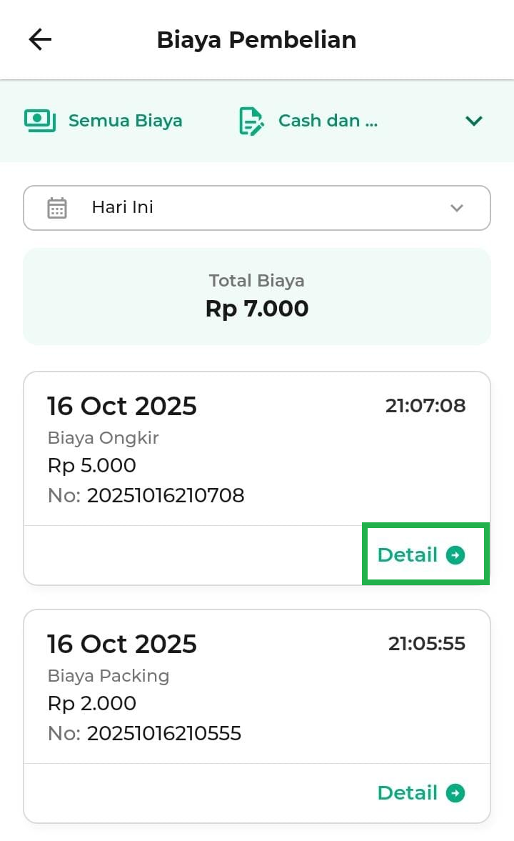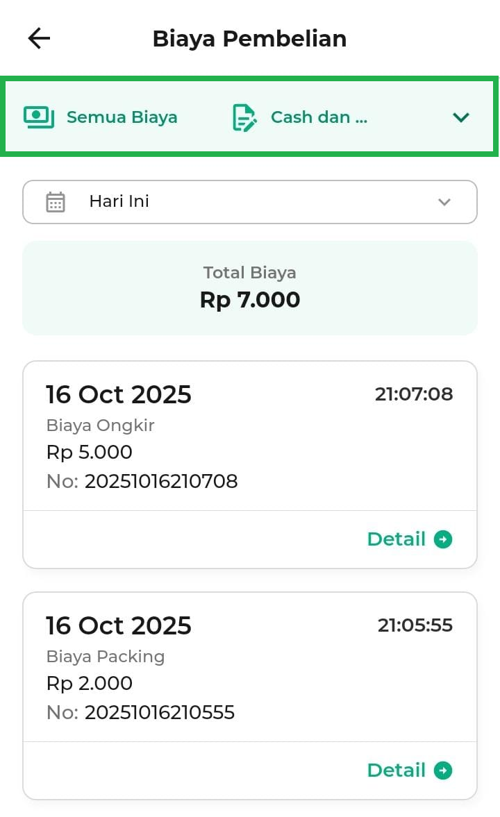 - 7 Hari Terakhir: menampilkan biaya pembelian selama 7 hari.